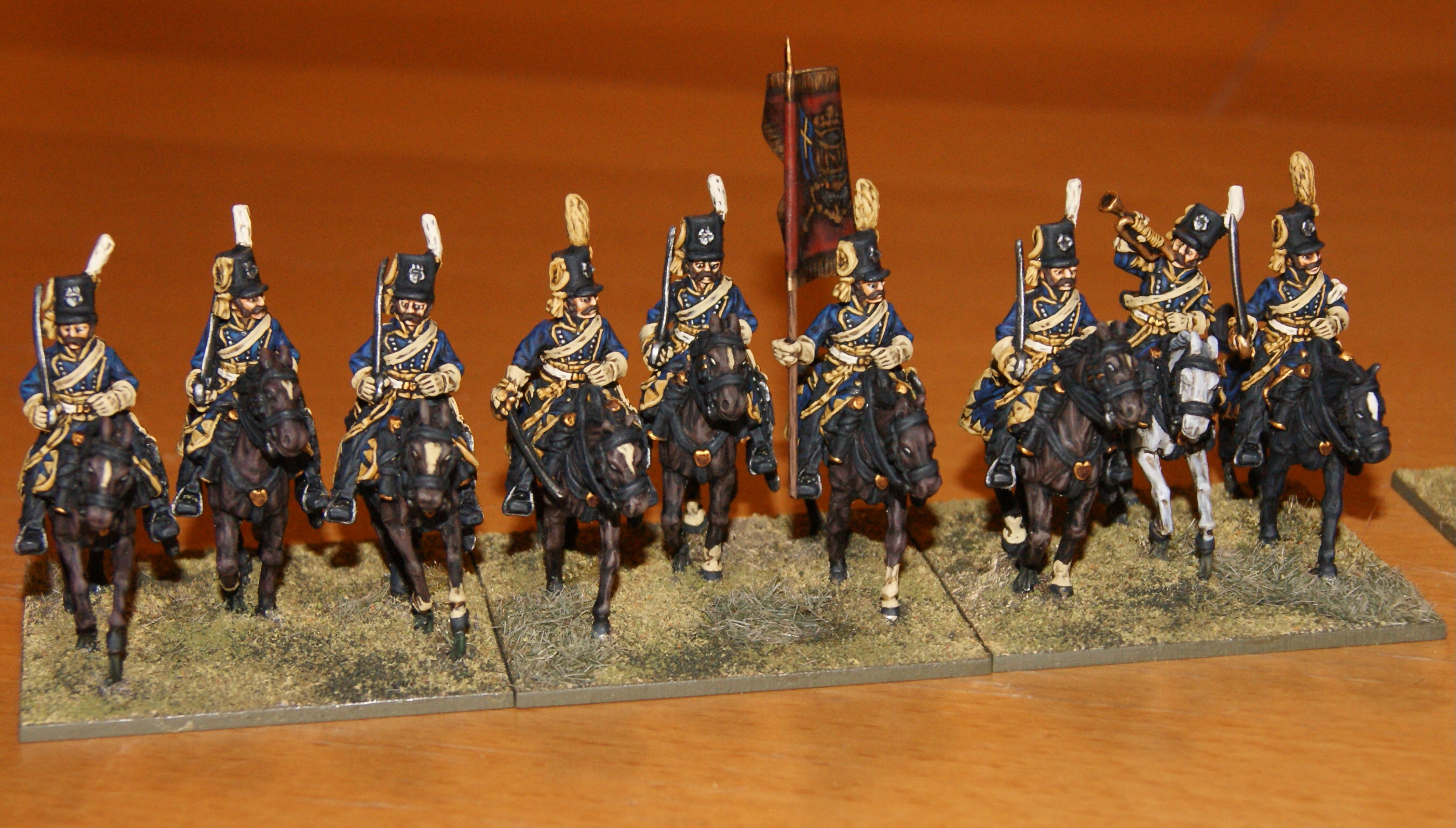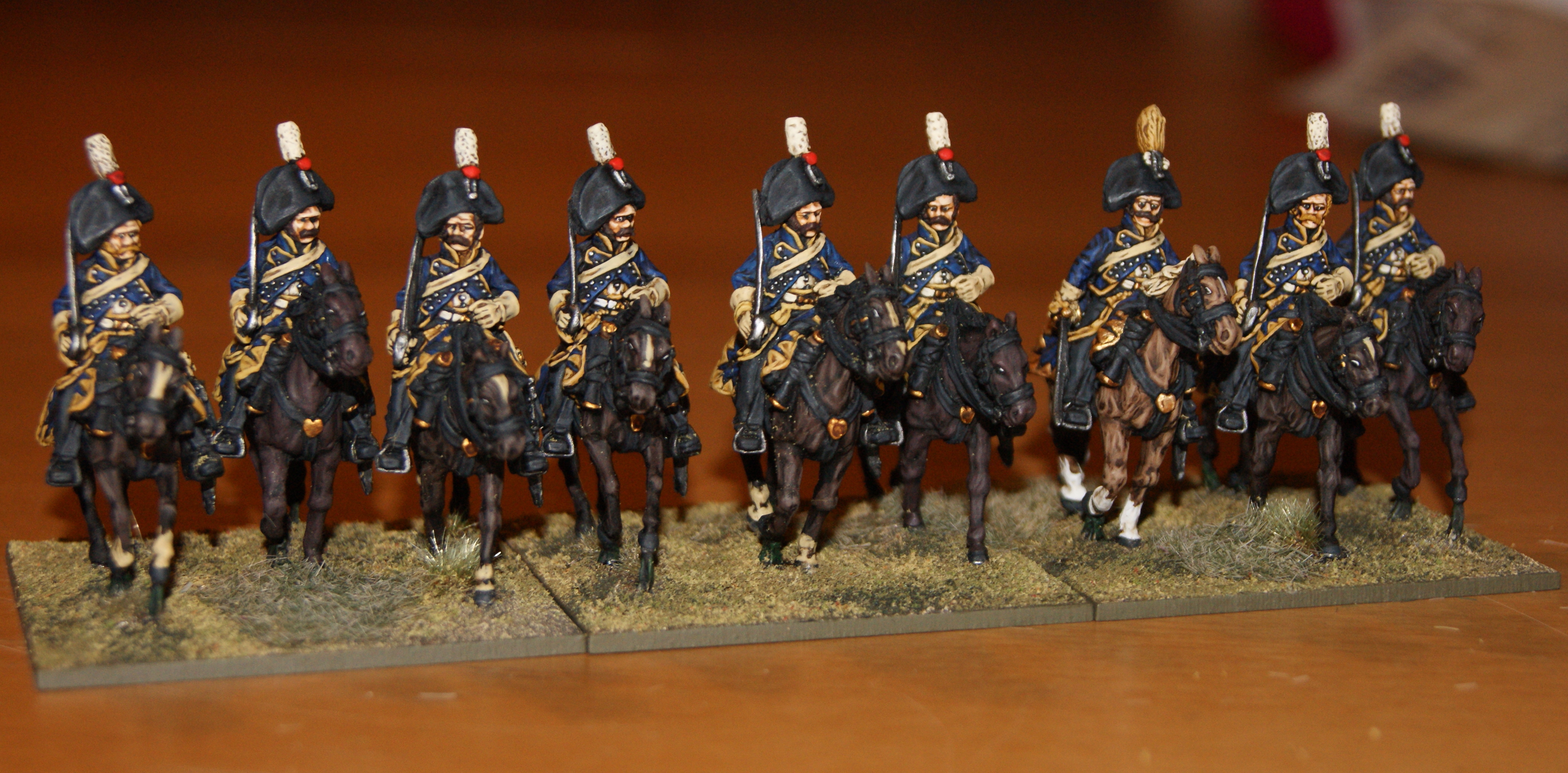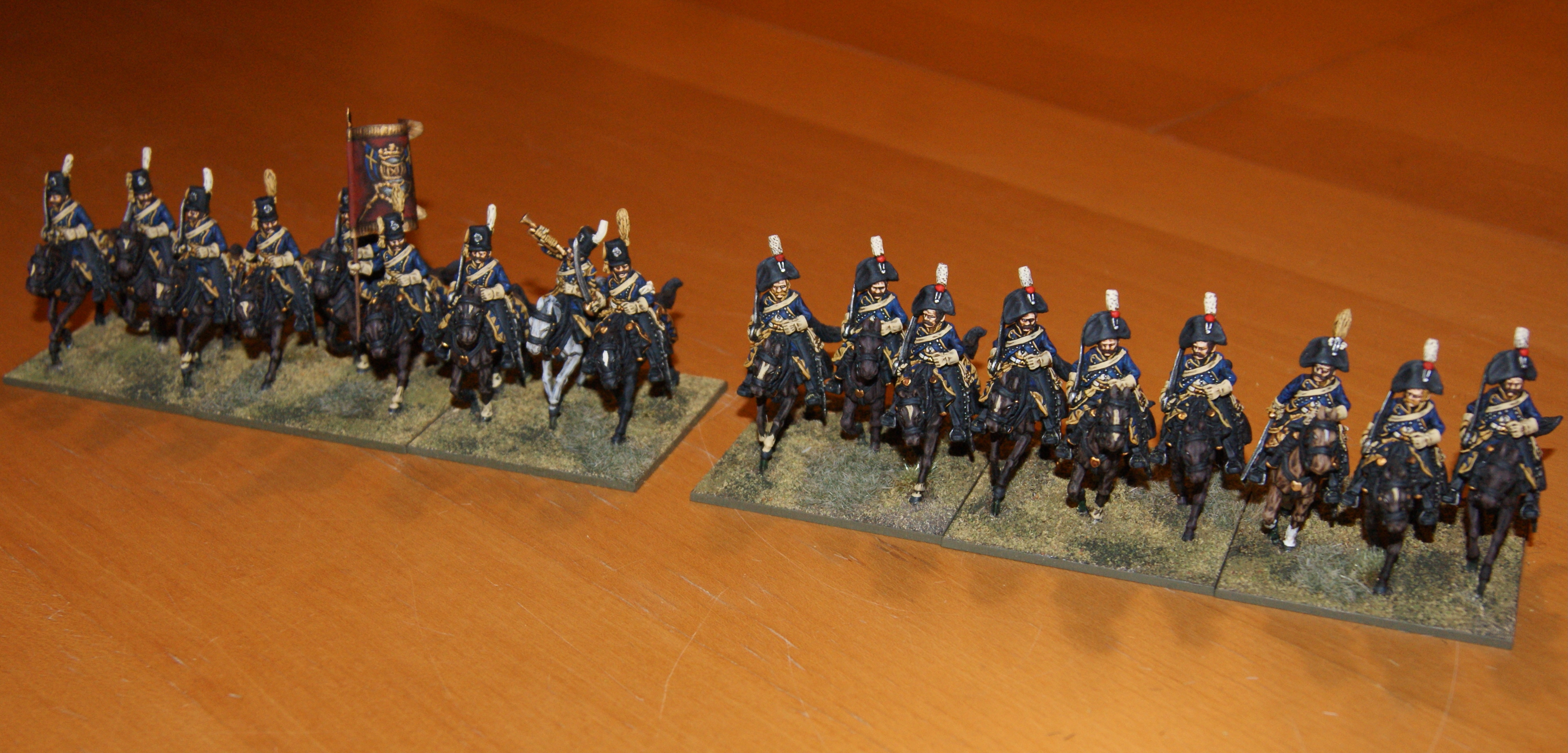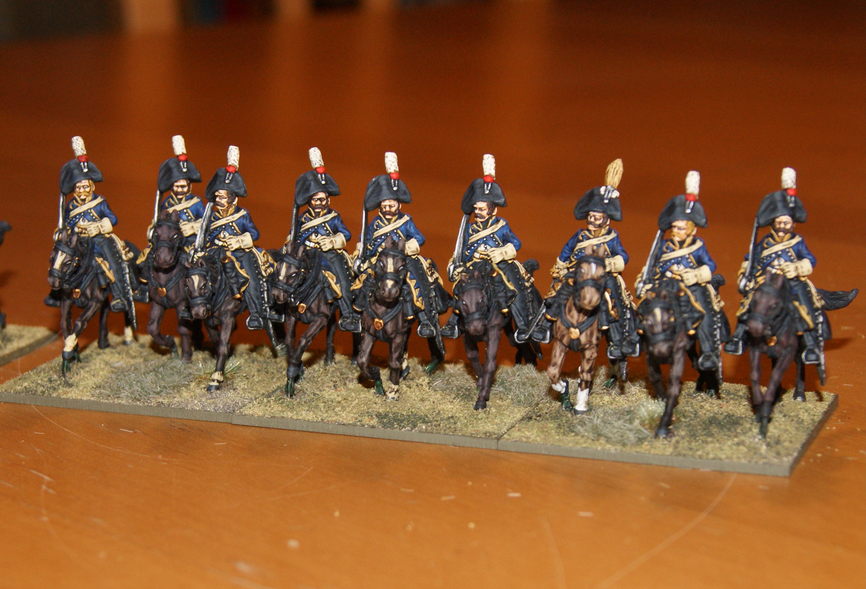 In the past couple of weeks, Ive been re-basing my 28mm Napoleonic figures. The Finnish army was already re-based, apart from the cavalry. I waited with the re-basing as I was planning to add more figures anyway. Now that Ive painted some additional figures to these, getting them up to 9 men per unit, it was time to re-base them. The closer basing does look better for cavalry and it somehow seems that this is the way the Perry figures are meant to be based. Also, these 9-man units now take up exactly the same amount of frontage as they did before as 6-man units (based less closely together).