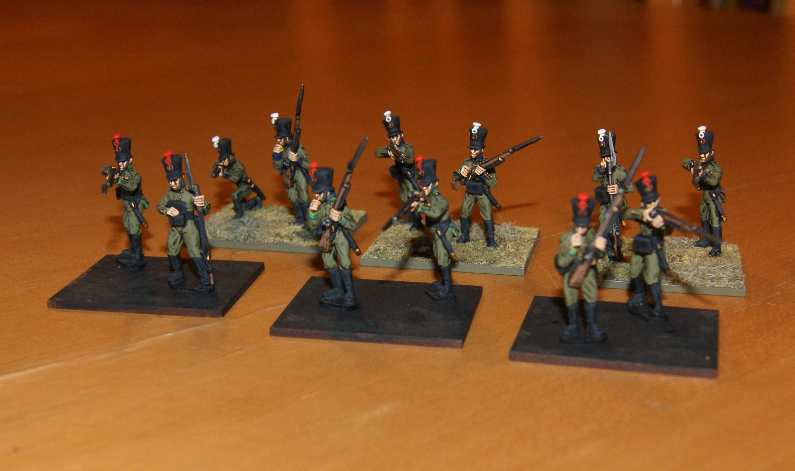 The Russian jägers are part of a larger collection which consists of quite a few miniatures, although mostly too few in each unit to make up useful battalions/squadrons in the new basing scheme. The skirmishers are of course easy to do as they are. Im hoping to add the necessary figures sometime in the future, so maybe more to come there further down the road. In particular, Id be looking to paint a jäger battalion in the style of these chaps.