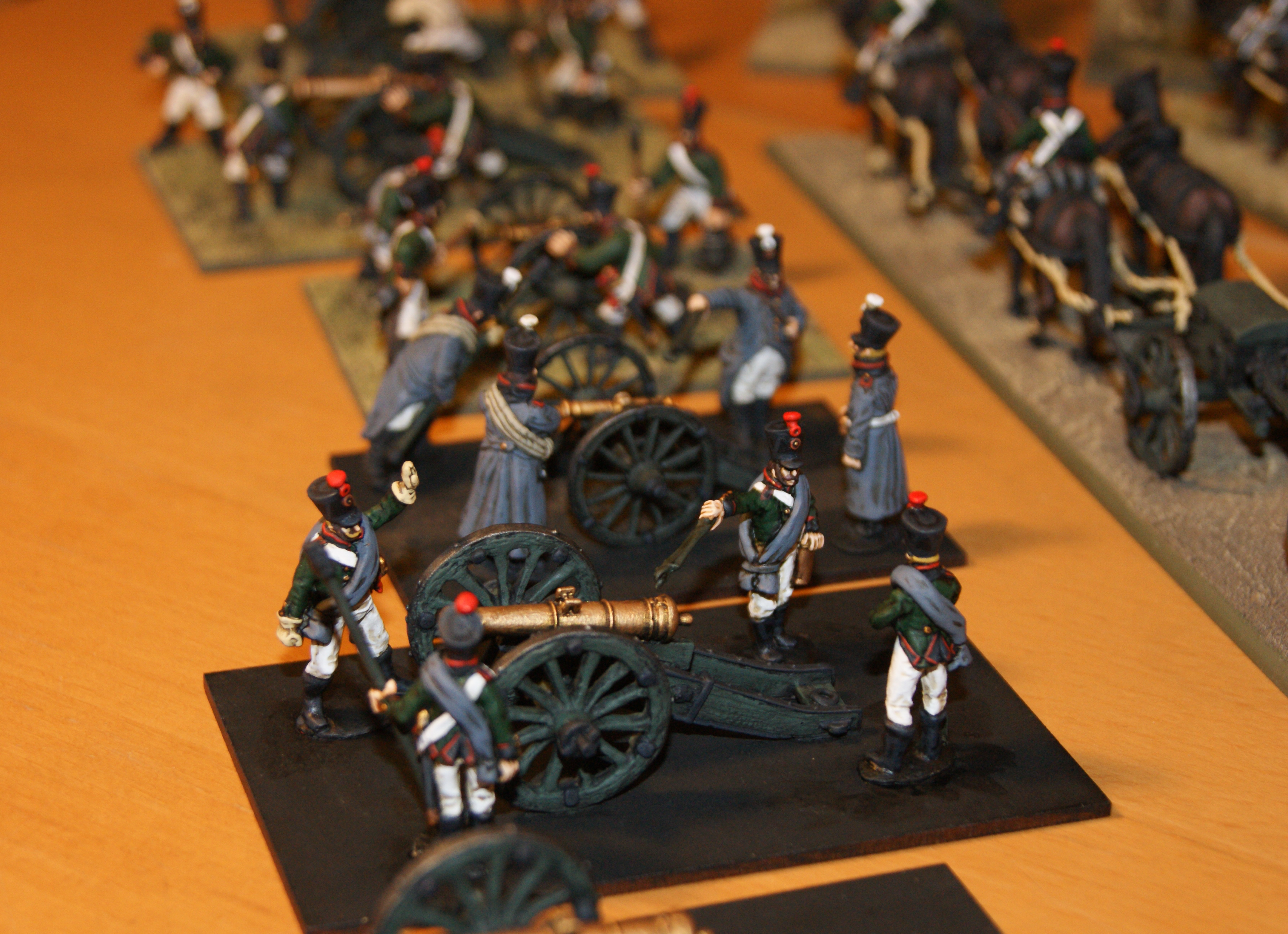 As you can see, the basic infantry figures are all Brigade Games figures (of the old Victrix range). The colonels are also by Brigade. Some commanders are Perry figures and some of them are Warlord figures. The artillery crew pictured here are all Warlord, with Brigade heads; the limbers and artillery pieces are all by Perry.