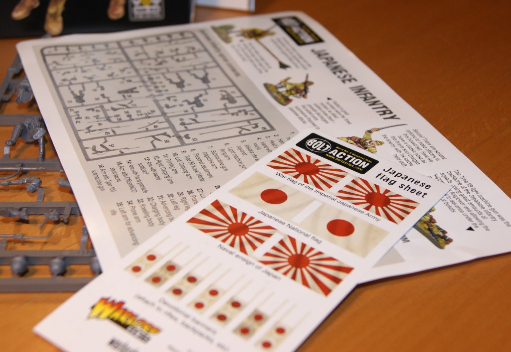 Having looked more closely at the contents and assembled some of the figures, the first impression is confirmed. The details are very crisp, and the set is logically organized. I had some problems assembling the figures, but the problems are the same with other similar plastic sets: for example, the bipod support for the prone light machine gunner is very difficult to cut away from the sprue. I tried it twice with different knives, but the small piece broke in two, both times. I ended up gluing the piece back together and this worked well, even though it was fiddly. It has to be said that this and some other of the fine detail can require some patience and modelling experience to get through. As for the machine gun pieces, there are six of them, but you’ll only need one or two, especially if you are doing full sized Japanese squads. In fact, strictly speaking you dont need them at all, as there is an option to build up to six figures carrying the machine guns in an upright position as well – they dont suffer from the problem with the bipod.