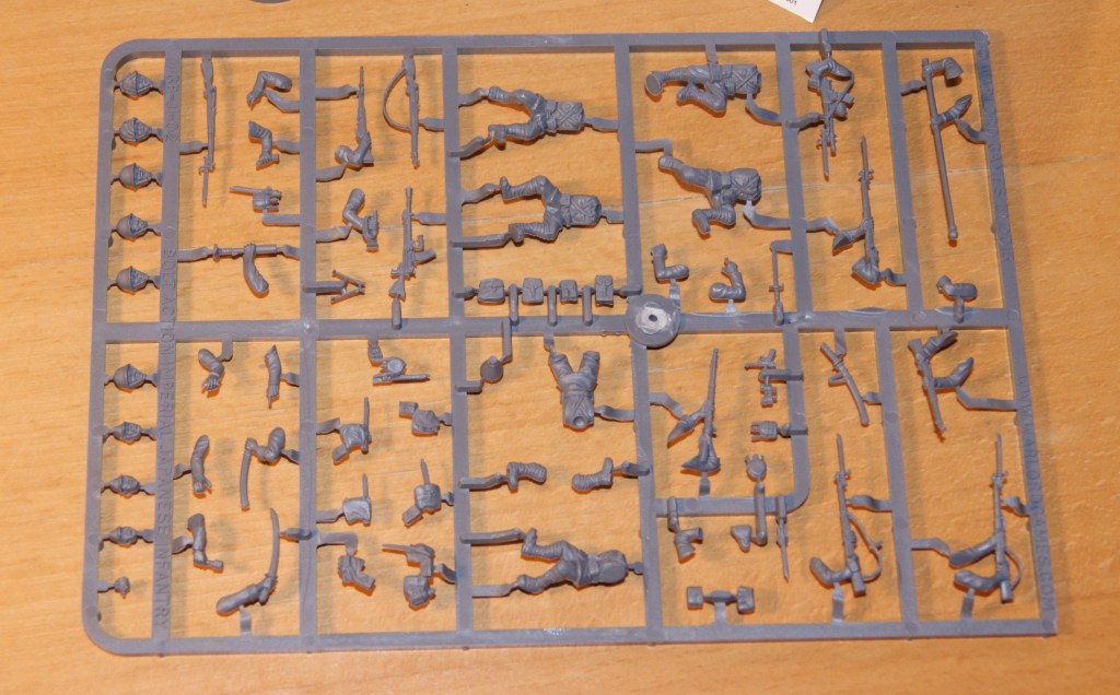 The versatility of the set has a down side: some figures have to be assembled from as much as ten separate pieces. However, for me at least, I will be doing most of them as standard riflemen, which means body, head, arms, equipment pack and base. The equipment packs come as one piece and most of the arms come as a set of two arms holding a rifle. In other words, in most cases, the figures will be assembled from five pieces, including the base. This isnt too bad. Comparing this set to Warlord’s Russian set, which I have used a lot, the Japanese only get one prone figure per sprue, where the Russian set has two on each sprue. This is probably a good thing, as five prone figures is already really more than you need.