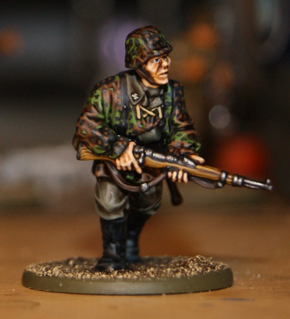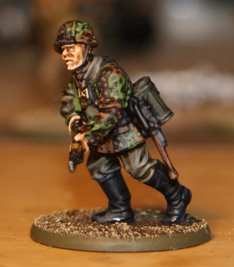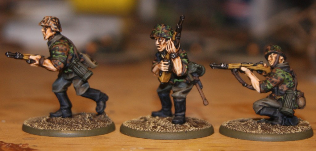 This is a first attempt at German panzergrenadiers as they would have appeared at the battle of Kursk in 1943. There are no miniatures available that are perfectly suitable for this period. Most are designed for “late war”, that is 1944-45. Those figures most often have the low boots with gaiters, they have mp44s, panzerfausts et cetera, none of which were used at Kursk (some soldiers may perhaps have had low boots and gaiters).