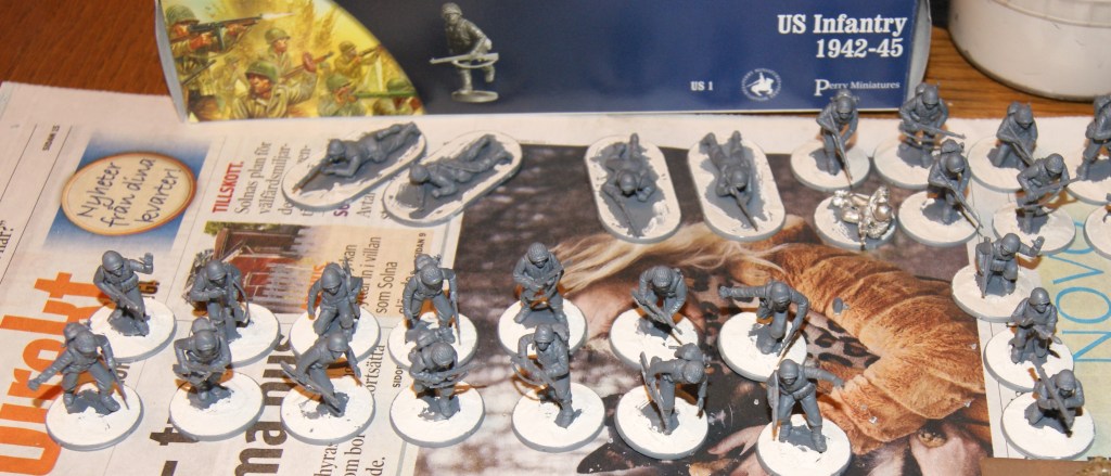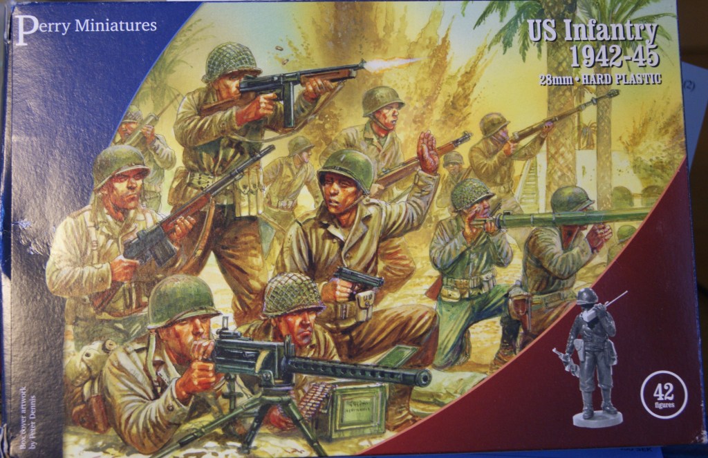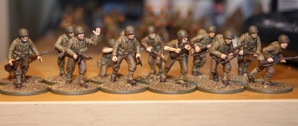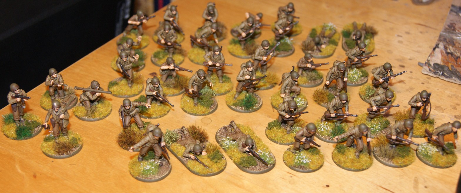 These are WW2 US infantry made by Perry Miniatures. Most of them are plastic figures from the box set, with a few metal figures added in for variation. The metal figures have no jackets on, they are wearing only their shirts. The plastic set is excellent and in itself contains miniatures to create a whole platoon for Chain of Command and other games. A full platoon consists of three 12-man squads, each including an nco carrying a sub-machine gun and one BAR automatic rifle gunner. There is also an officer, sergeant and a bazooka team. In addition, the box contains a couple of .30 cal machine guns, a sniper and various options for weapons, heads etc.
