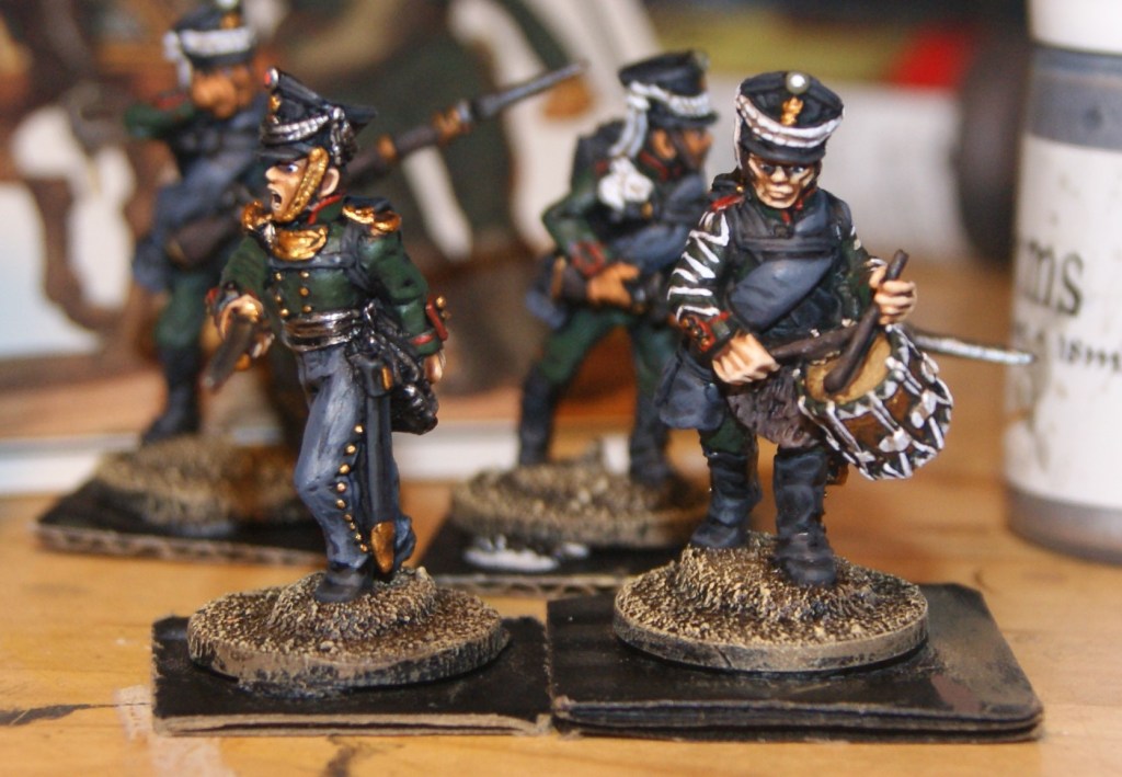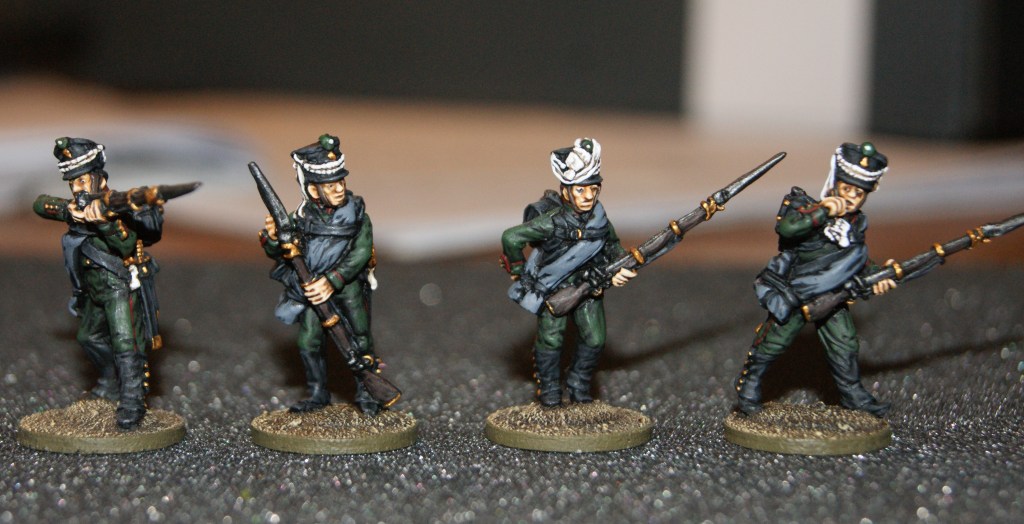 These are Perry and Foundry miniatures, metal jägers in skirmish poses. Hope to add many more of these.