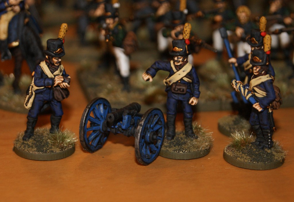 Some Perry miniatures Swedish napoleonic artillerymen, painted in the uniforms of the Finnish artillery regiment. There is a 6-pdr gun and a 3-pdr. The 3-pdrs were on their way out, but they were nonetheless used extensively in Finland. In the difficult terrain the lighter pieces were more useful than they would have been in other regions of the Napoleonic wars. The 3-pdrs are heavily converted AWI pieces by Foundry which I greenstuffed into the likeness of a piece in the Army museum in Stockholm which supposedly saw service with the Savolax brigade in 1808. The limbers and ammunition wagon are Perry AWI models.