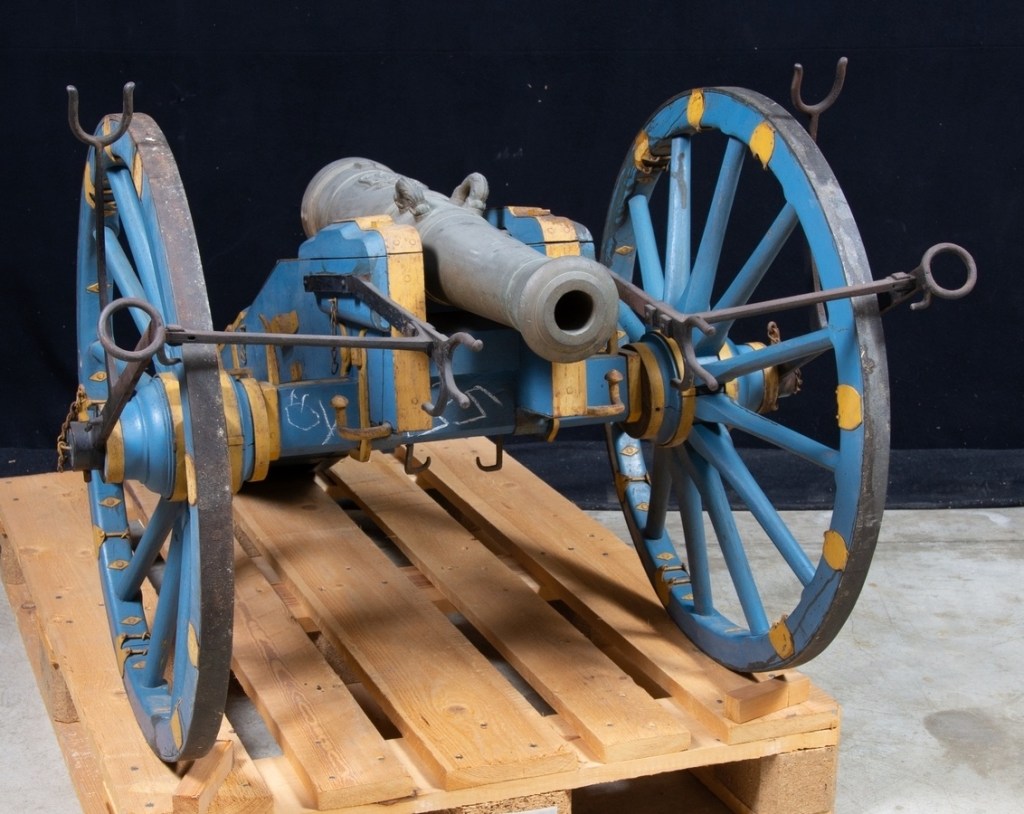 I painted the gun as a bronze gun with a blue and yellow carriage. This was common in the 18th century, and it seems likely that some older guns would have still looked like this in 1808. Below is a late 18th century model gun in the collections of the Army Museum in Stockholm. The iron bars attached to the carriage were used when the gun was pulled by “action horses”, i e when the gun was moved around the field of battle, but not limbered. This practice was discontinued just prior to the war of 1808, and by then the gun was drawn by the men using ropes instead.