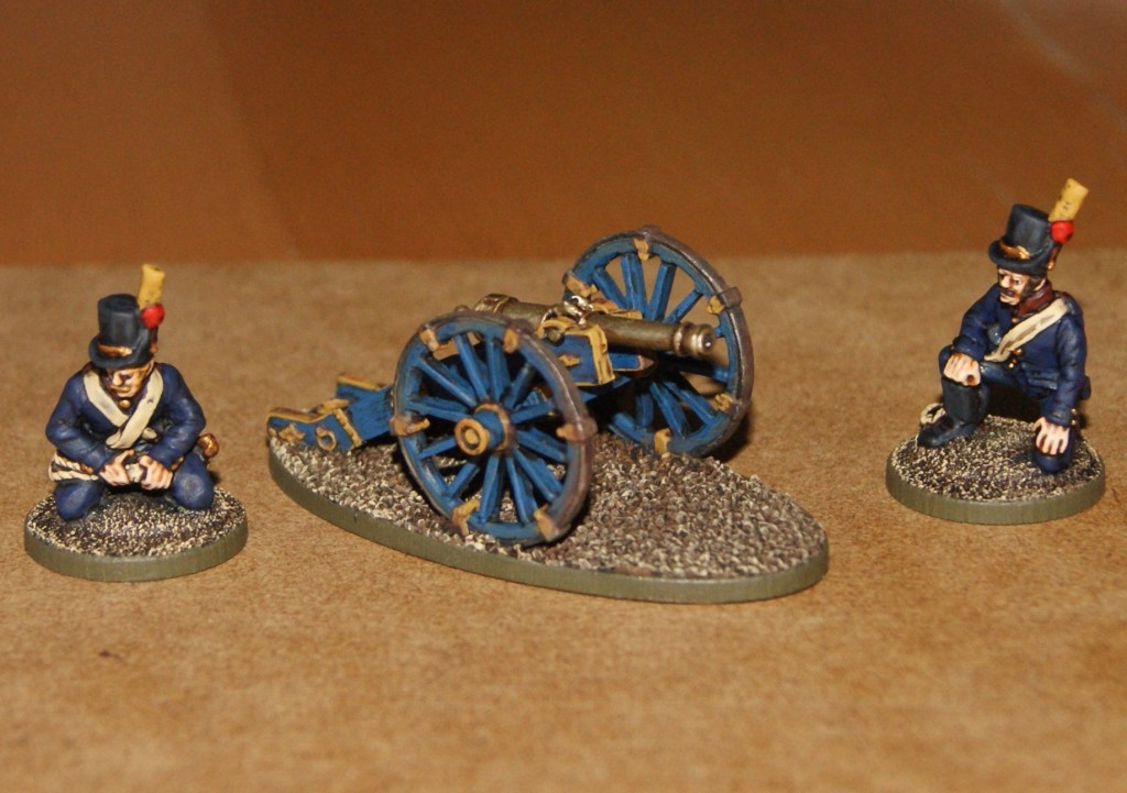 I just finished a couple of figures and a cannon which are painted as belonging to the Finnish artillery regiment. The figures are Perry Austrian artillerymen with Swedish heads. The gun is a Hessians AWI piece. The gun, a 4-pdr, is called “Swedish”, but it was really a French gun which was similar to the Swedish system of 1725 (Cronstedt). Similar guns were in use in the Swedish army in 1808, of the Cronstedt system, as well as the later Ehrensvärd, alongside the more modern Helvig system. From the sources it is clear that roughly half of the guns fielded in the battles in Finland were of the new (1804, Helvig) system, while the other half were of various older types. Some of the older guns were iron, some metal (bronze). The older guns were much heavier, partly because they had oak carriages. Many of them were 3-pounders (the Helvig guns were all 6-pounders).