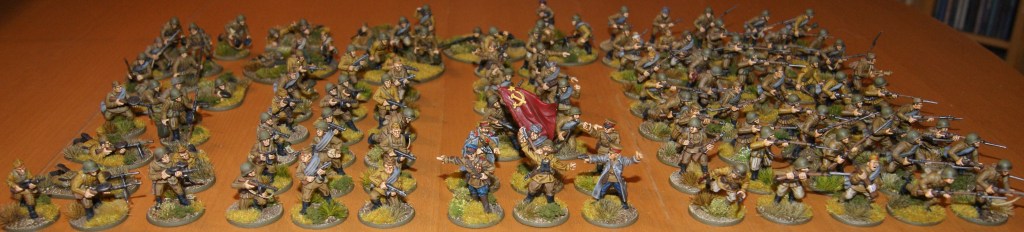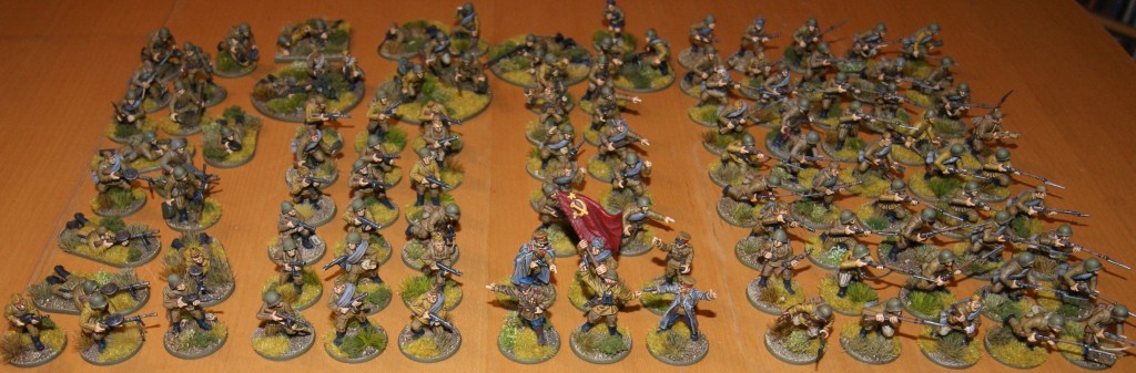The organizational structure of Soviet rifle and motorized rifle companies changed an inordinate number of times during the war. More importantly, paper strengths were of course seldom reached in practice. Originally, each platoon had four squads, but the fourth was, as I understand it, often dropped and after 42 this was reflected on paper as well. I dont have enough figures for 12 squads unless they are understrength, but with the extra figures I have I could probably just about manage 9×11 men (squads originally consisted of 11 men, but this also changed).