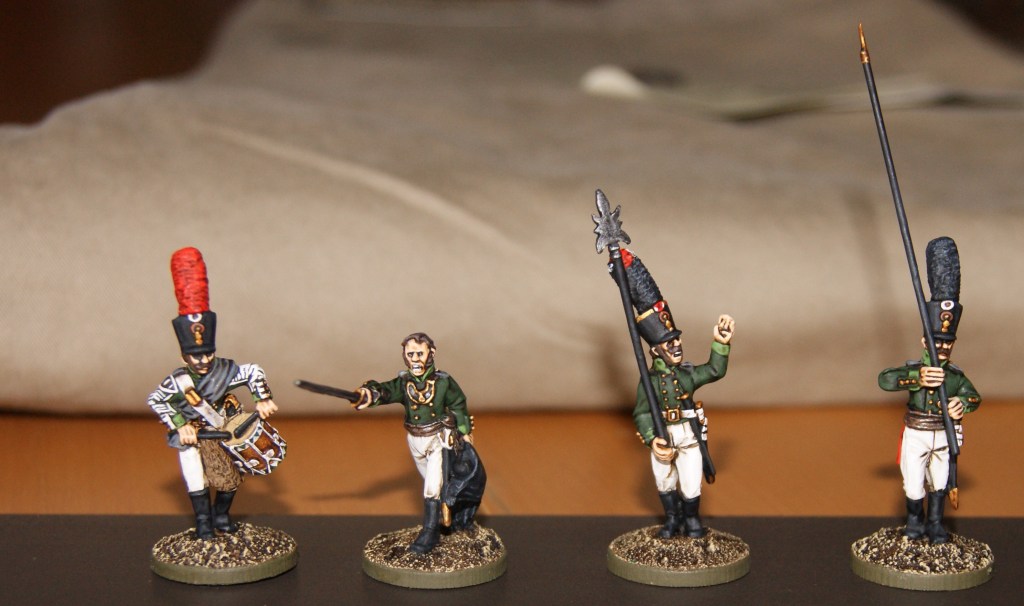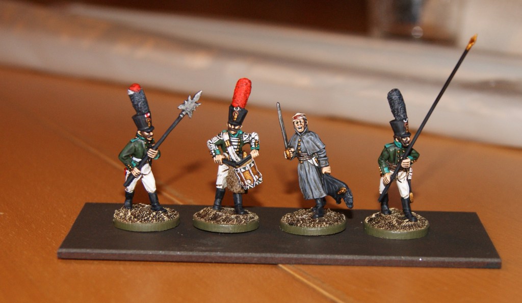 I just finished the command figures for the Mogilev and Sevsk grenadier battalions. With these I have painted 8×16 Russian infantry for the 1808 setting. Just as I was uploading the pictures I realized I missed the gold band around the top of the shako of the Sevsk NCO. Ill have to go back and correct that…