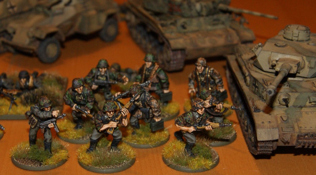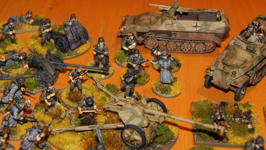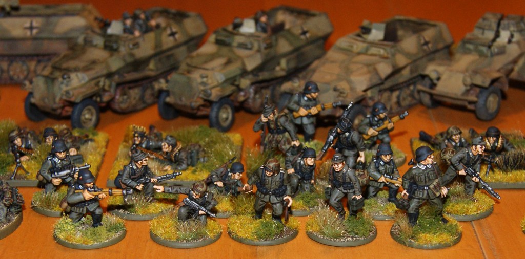 As I had quite a few of my WW2 German figures out and gathered in one place, I thought I might as well take a few pictures. I have a large number of early war Germans (appropriate for 1939–1941) that are not included here. As you can see there are some Germans in greatcoats, some in summer uniform, some in earlier style gear, some with late war equipment, some SS, some regular army. I can scratch together a fairly reasonable mid-war panzer grenadier platoon, but I really need more of every type of German to be able to field troops appropriate for typical Normandy, eastern front or Blitzkrieg type scenarios.