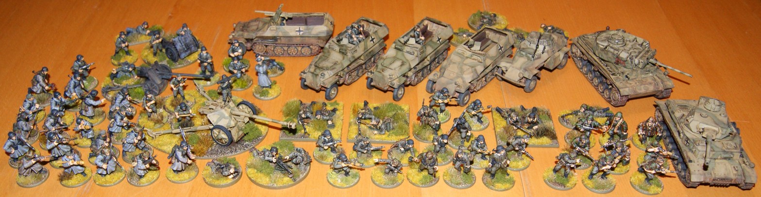 As I had quite a few of my WW2 German figures out and gathered in one place, I thought I might as well take a few pictures. I have a large number of early war Germans (appropriate for 1939–1941) that are not included here. As you can see there are some Germans in greatcoats, some in summer uniform, some in earlier style gear, some with late war equipment, some SS, some regular army. I can scratch together a fairly reasonable mid-war panzer grenadier platoon, but I really need more of every type of German to be able to field troops appropriate for typical Normandy, eastern front or Blitzkrieg type scenarios.