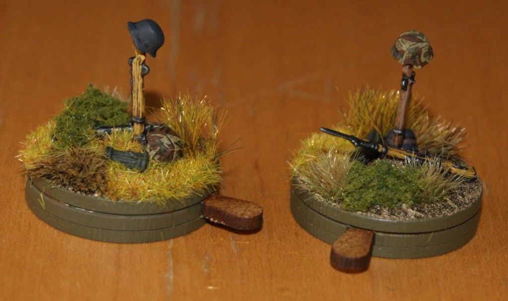 These are some markers for WW2 gaming. Casualty figures are from Great Escape Games, pin markers were made from Warlord Games’ old markers for Bolt Action with some extra bits, mounted on bases from Warbases. Lastly, fire/smoke markers, mainly for marking knocked out tanks or destroyed buildings. All work for both Bolt Action and Chain of Command. The burning tanks and dead Soviets arent really necessary to play, but they look nice. Casualty figures can be useful in game terms when you have weapon crews fixed to one and the same base and need to mark losses.