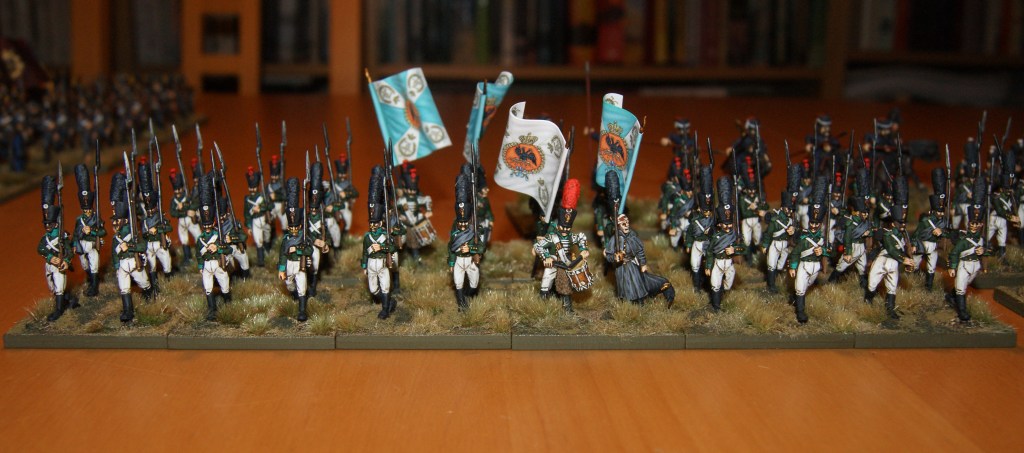 I had reason to survey all my finished units of Russians and Swedes/Finns recently, and naturally I took a few pictures. A few new additions have been made in the recent months, but I need to pick up pace with infantry and cavalry (especially on the Russian side) to really get this project into a position to start a major campaign going. Also, the Russians are lagging behind the Swedes. I have done a total of 12 battalions of infantry (three of them are 24-man units) on the Swedish side. The Russians are 9 battalions (two of which are 24-man units), with less artillery and cavalry too. I am currently working on both a couple of more cavalry and infantry units for the Russians. As both armies are only meant to be played against each other, trying to match the strength of both sides is a good idea. In typical Napoleonic wargames terms, the numbers are small (thank God!). But the good thing about the Finnish war is that even the largest battles (such as Oravais in september of 1808) involved only about 15 battalions on each side. I am feeling some frustration that I really only have a few more units to paint until I have a really good selection for a number of scenarios. Its just that I cant quite seem to focus on those must have infantry units that would be really useful, and I go convert a general figure or paint some fancy uhlans instead…