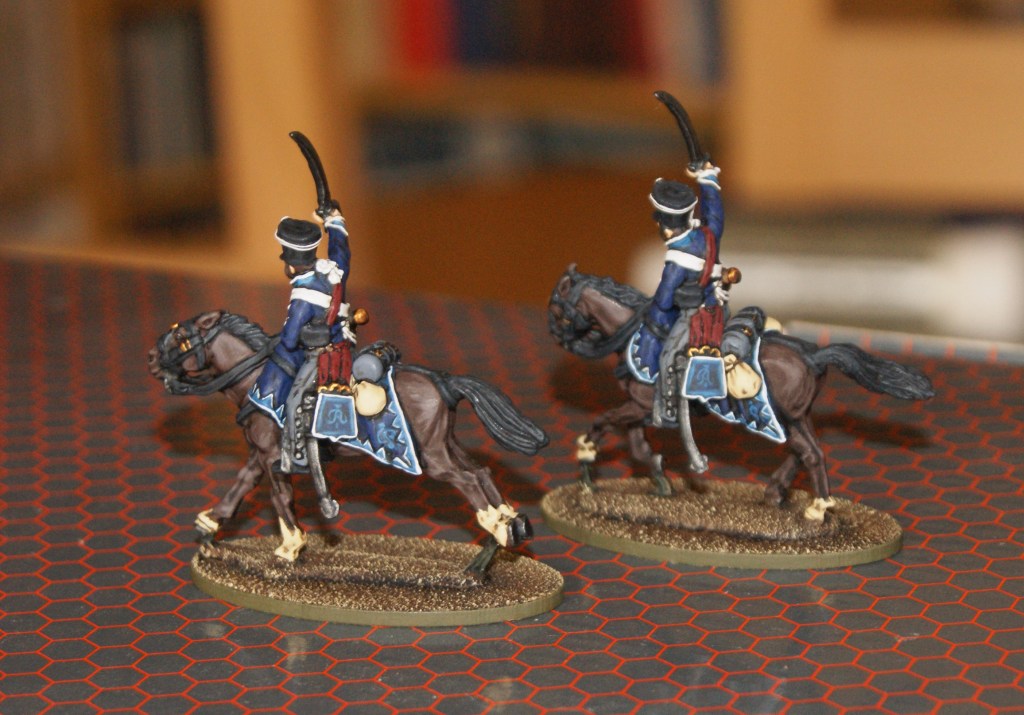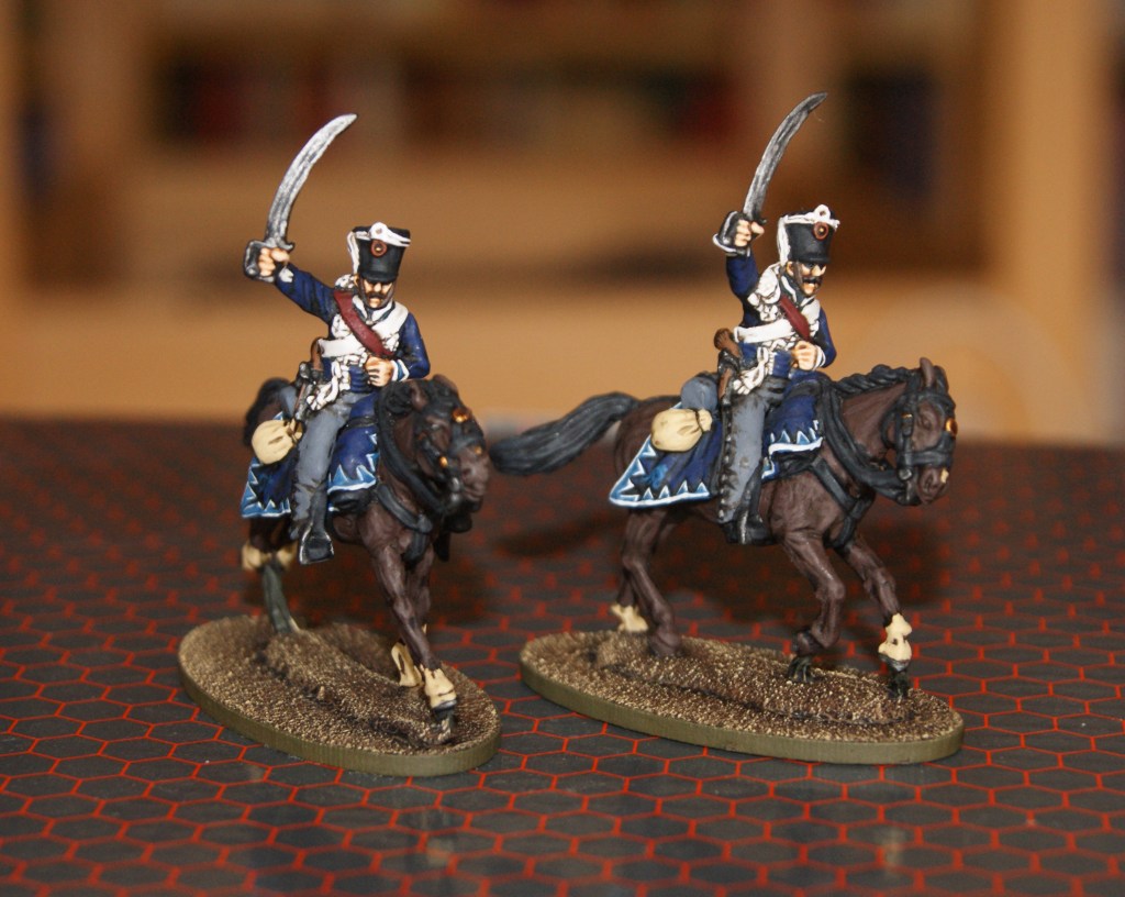 A recently finished two more badly needed Russian hussars. I started with these many months (even years?) ago. They are a pain because every figure requires a bit of remodeling to fit the period (1808). The base models are by Perry miniatures, but the heads have been replaced with period appropriate Brigade Games heads wearing older type shakos. The tassels are scratch made using wire and green stuff, which is fairly difficult (at least for my skill level!). To make matters worse, the painting process was nearly ruined because of cracking of the AP wash, which is a recurring problem for me. Whether it is caused by shoddy undercoating, humidity (too high or too low?), too short a drying time, I really dont know. Anyhow, I am happy to have finished these, these Grodno hussars were the most commonly seen Russian cavalry unit in the Finnish war together with the ubiquitous cossacks of course. Consequently I will need to do at least 12 or preferably 16 of these. So far, I have done 3…