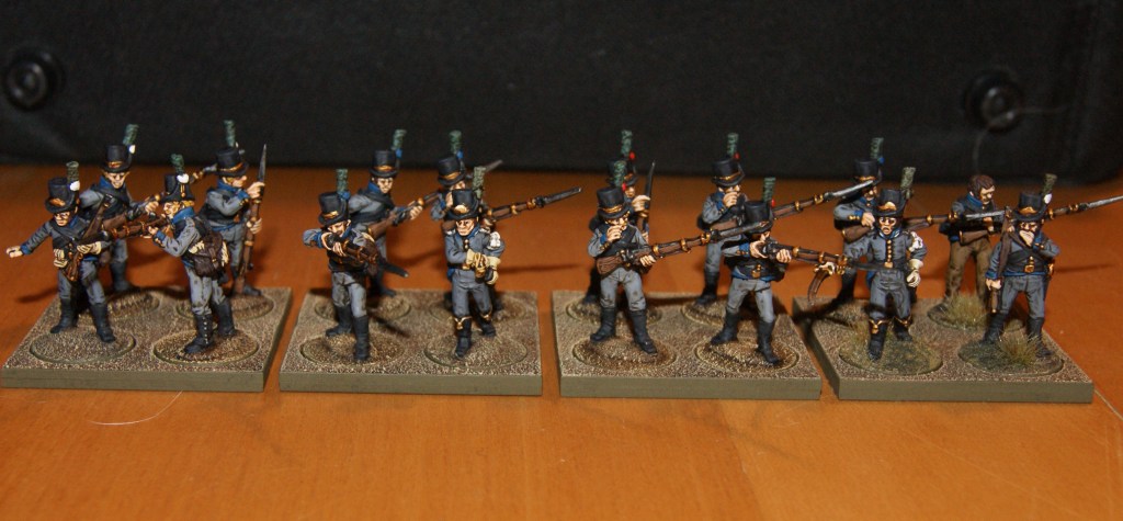 Just finished this set of 16 figures of Finnish jägers. The uniform corresponds to the Nyland, Björneborg or Åbo regiments. Nyland and Björneborg wore light blue facings, Åbo dark blue. To make things simple, I chose a mid-blue color, and will use them to represent any of these regiments as I need them to! The Perrys sell a set of “Nyland jäger” figures with shakos. I used these to make the command figures here, but as I have seen no source or other reference to the Nyland jägers actually wearing shakos, I exchanged them for regular hats. If I am wrong on this point, I can always go back and paint a few more…