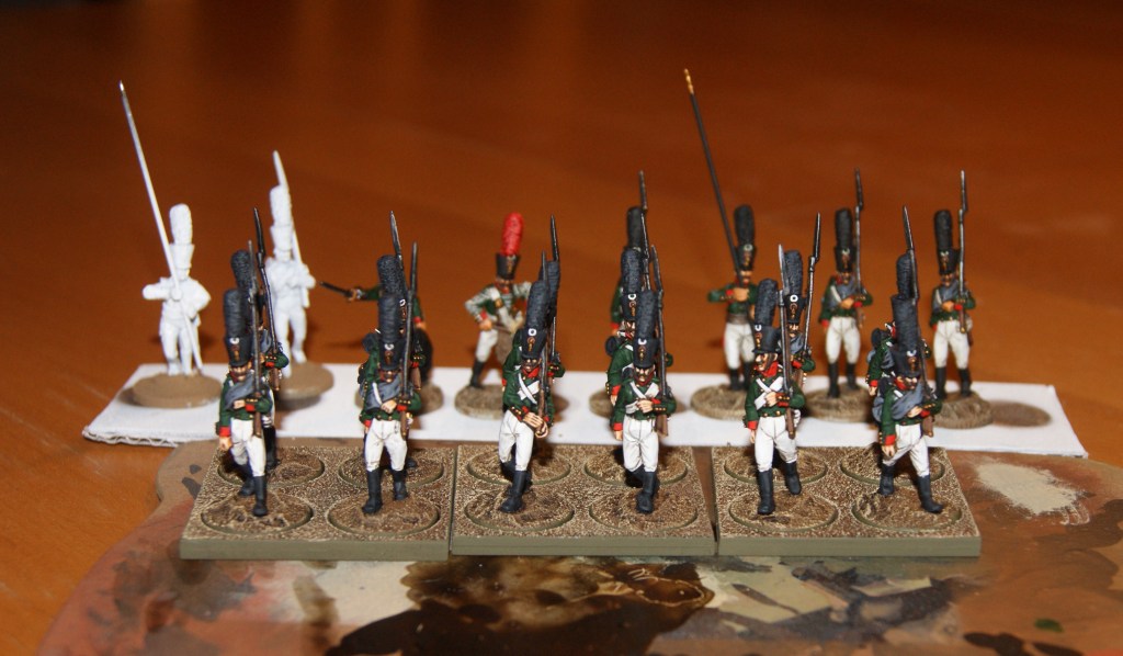 Trying to keep the momentum going with my napoleonic stuff. The first battalion of the Petrovsk regiment is soon to be finished at 20 figures. This regiment served in many of the battles in Finland, and would really have been a good place to start the whole project. They wear a uniform which is similar to what a couple of years later became the standard uniform for all Russian regiments. In addition, they are very similar to a few other important regiments, namely the Lithuanian, the Bielosersk and the Tenginsk regts. These were all very much active in Finland and they all belonged to the same inspection, i e, carried the same red and-black colored flags. The only difference was in the shoulder straps (these were dark green, light green, red and rose). To me it seems reasonable to play these as interchangeable with one another, so that the Petrovsk may represent the Tenginsk or Lithuanian if needed for a particular scenario. Hopefully, I will be able to paint up the 3rd (musketeer) battalion of the Petrovsk and both battalions of the Bielosersk as well in the near future.