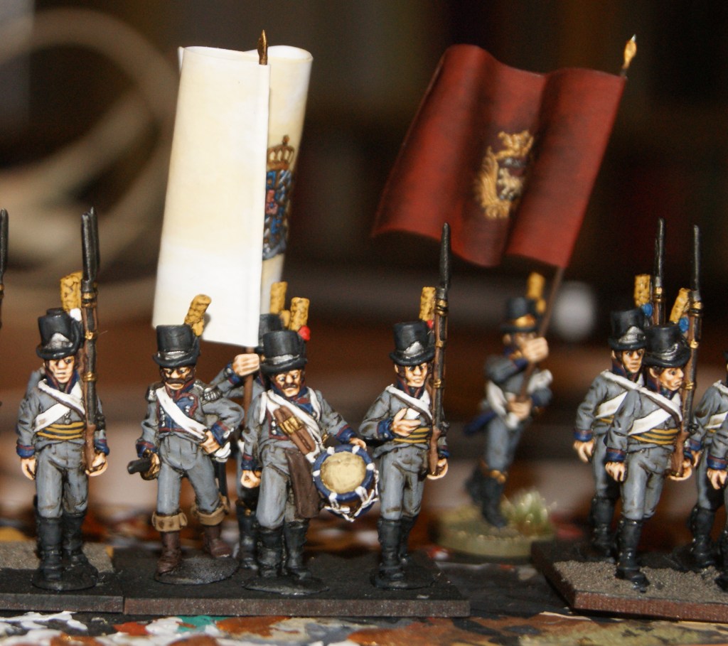 I should add that the officer and drummer in this unit were made from a pack of Perrys’ Spanish infantry, with heads swapped for Swedish ones. They have plastrons on their uniform, as the Swedish m/1802 uniform had. Whether Tavastehus had retained the plastron or not, I dont know – but I do know that some soldiers in the Finnish army still wore jackets with plastrons in 1808, although most of them probably didnt. Some had (like the Nyland regt., apparently) received the new 1807 uniform, but most wore the m/1806, either newly made or re-sewn from old 1802 jackets.