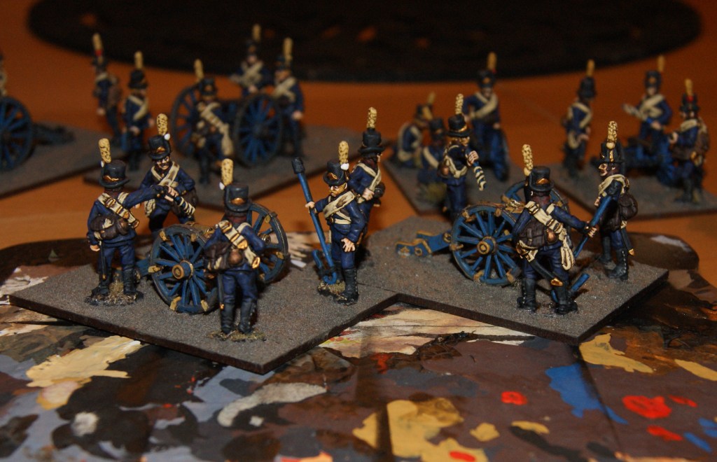 The artillery lacks a few figures, one cannon and one limber set, the aim being three two-gun batteries with limbers. The pieces are of three different types: a 6-pounder of the 1804 model (made by Perry miniatures); a 3-pounder field gun of an older type and finally a small battalion gun (referred to in Swedish sources as a “partikanon”, i e literally “raiding party gun”). The two latter types I made from a Perry AWI French 4-pounder and a Foundry AWI “grasshopper” (the smallest gun I could find). They are similar to preserved examples which can be seen on digitaltmuseum.se. Most artillery was painted blue and black at this time, but older holdovers from the 18th century would have retained the older blue and yellow scheme.