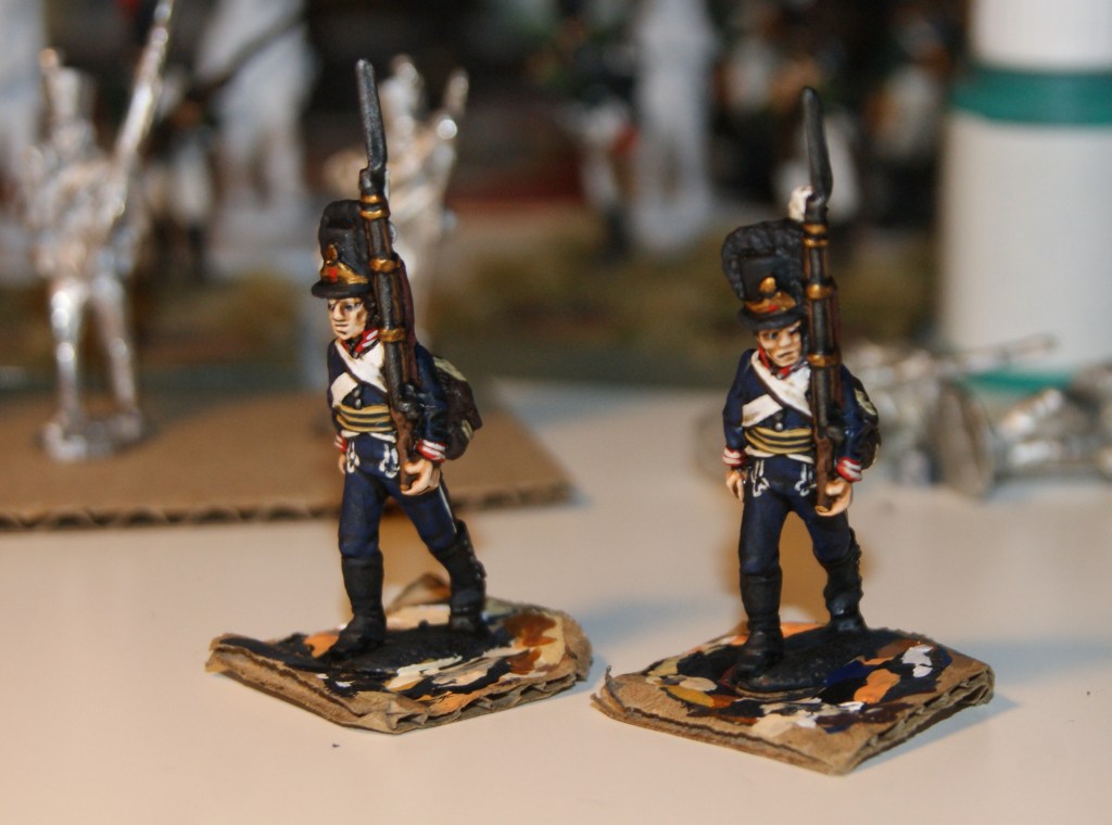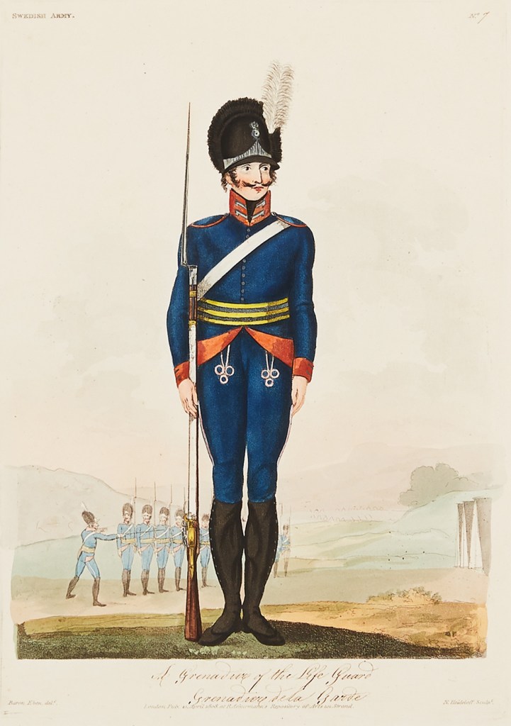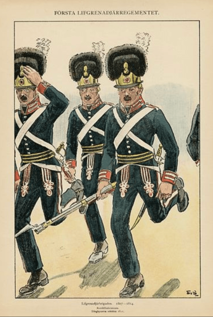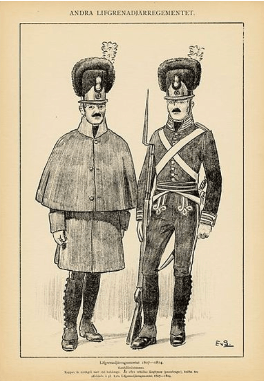 Livgrenadjärregementet apparently had serious problems with the supply of uniforms in 1809. Not all soldiers had received the new (1806) uniform, presumably some would have worn the older 1792 version, which had a white collar and white trousers. Those uniforms were certainly very worn by that time. A few soldiers had the new greatcoats, as seen in the illustration above. Whether all soldiers had the new hat, I do not know. Some newly arrived recruits and reserves would have worn civilian clothes. All of this means that it might be reasonable to (for example) paint some soldiers with white, grey or brown trousers or even mix in one or two with civilian clothes.