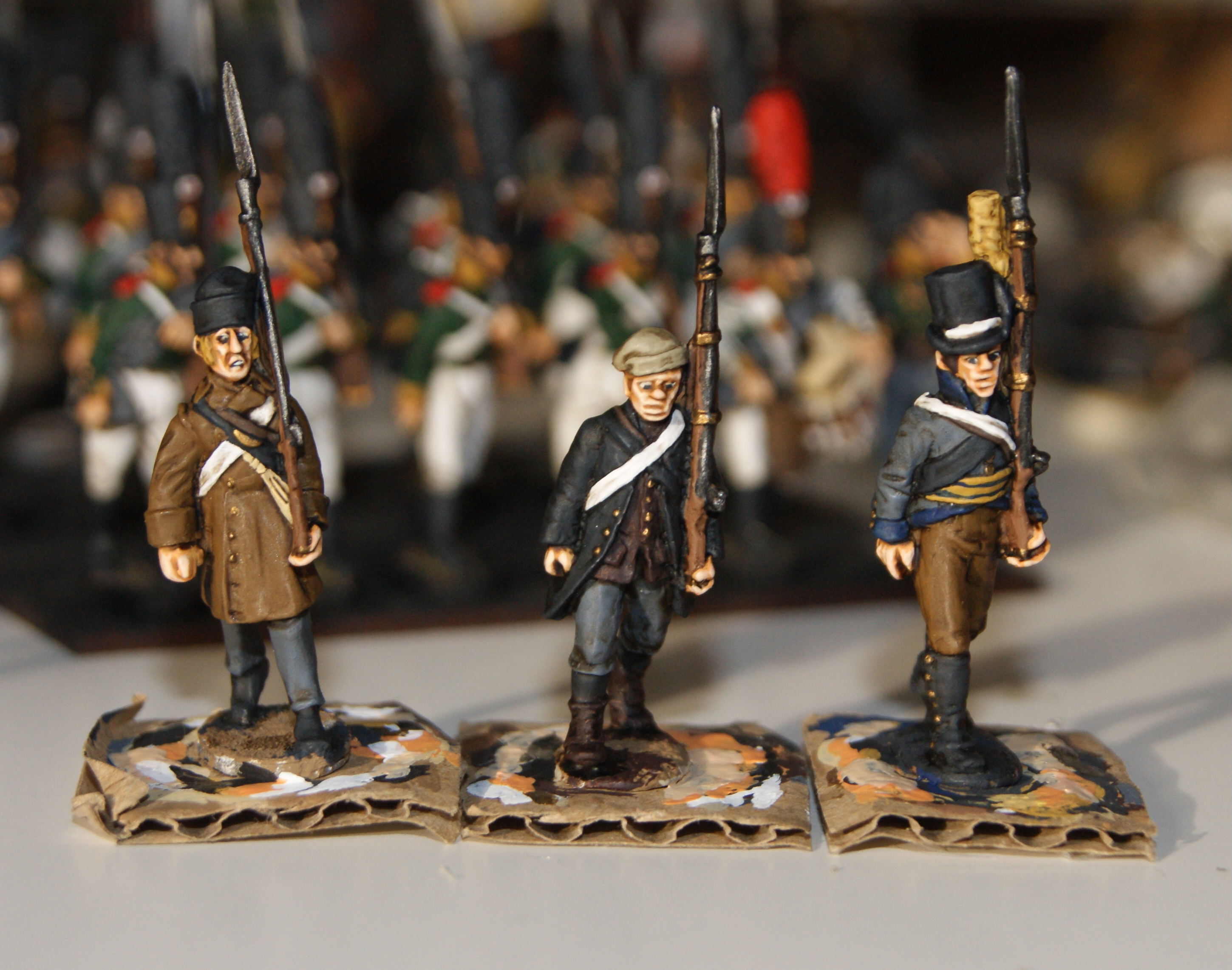 These are my first attempts at making some members of the Gyllenbögel free corps, a volunteer unit composed of various ex-soldiers and civilians. It was created in the summer of 1808 and saw action at a number of battles. The figures are simple conversions from Perry AWI figures and a Brigade Games Canadian 1812 militiaman (if I am not mistaken). The converting and painting on these is very quick and simple and I hope to be able to make quite a lot of these shortly. They will be complemented with Finnish uniformed officers and NCO:s, plus a few uniformed soldiers mixed in. I will need three, possibly four battalions; the free corps will make up the equivalent of a small brigade. Apart from the above ranges of figures, Ill use Perry French (1814 national guard), Norwegian landevaern and perhaps some Spanish and Prussian (Landwehr) figures. Some of them will need no converting at all, such as the many figures wearing caps or no headgear at all as well as the uniformed men. One of the battalions will consist of a larger part of uniformed soldiers, representing the “sharpshooter” battalion, which consisted solely of escaped soldiers.
