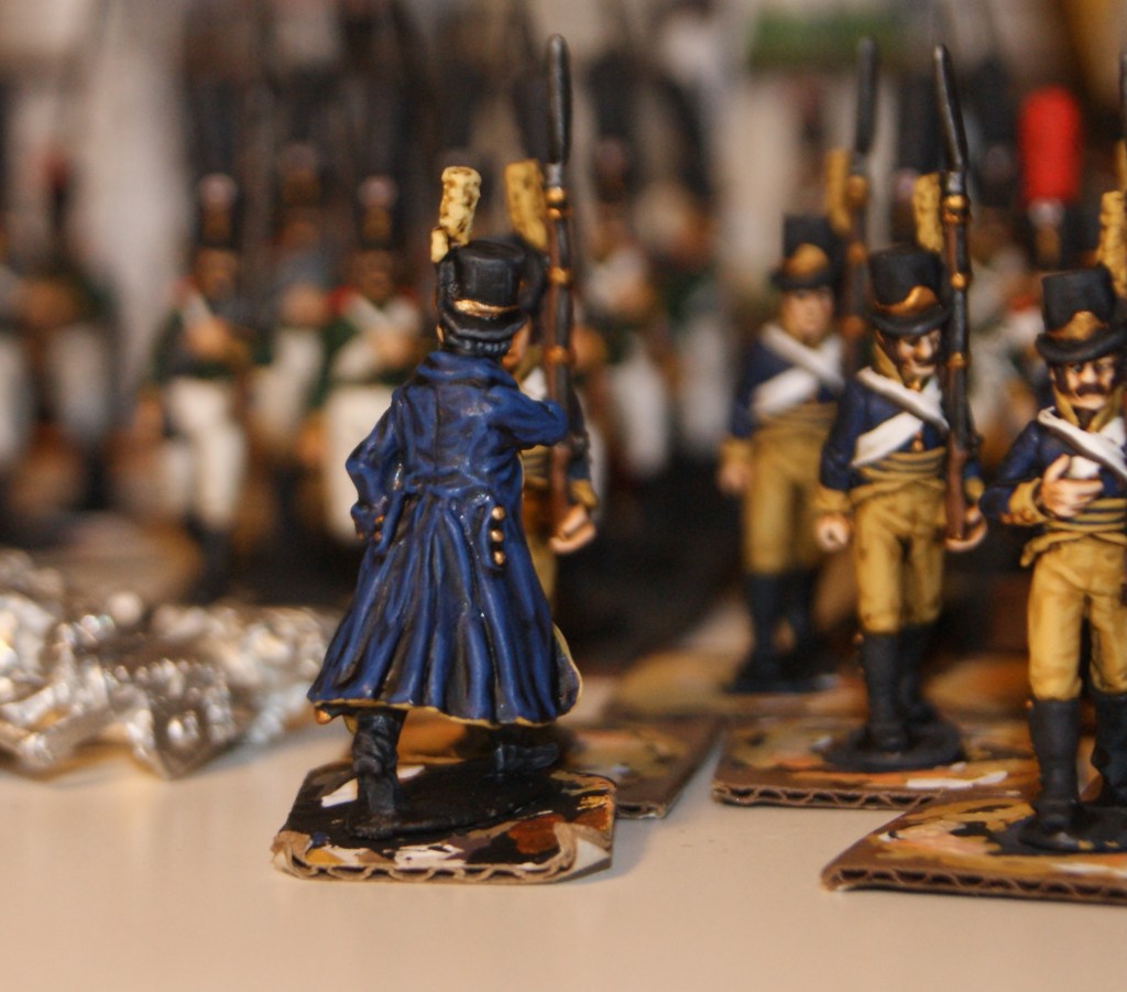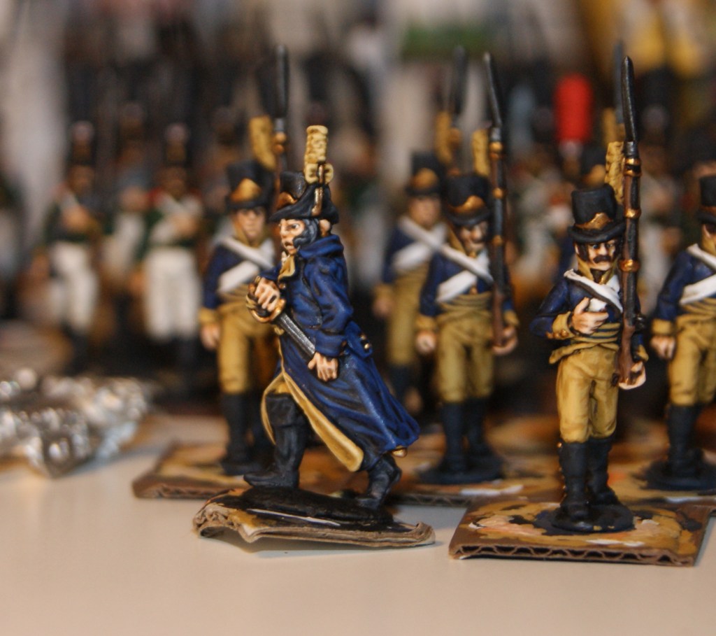 Areas such as the blue of the coat, the dark grey of the gaiters and boots, leather straps, dark leather of the shoulder bag, dark hair, and also the musket wood and all metal fittings, buttons etc, work pretty well without further highlighting. When batch painting, I also do all of one batch with the same color of the hair. Next batch will have light hair!