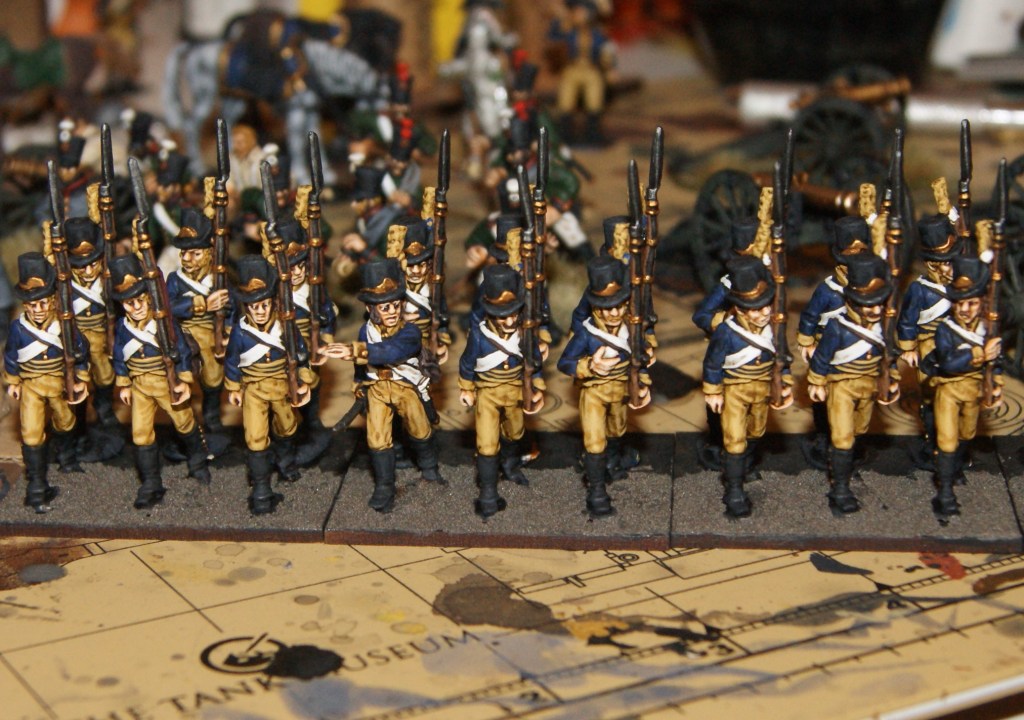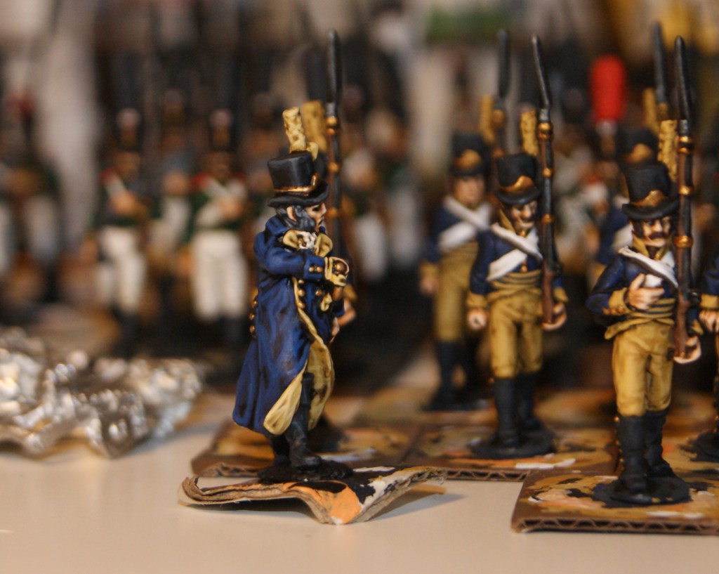 Yellow is a color that really needs highlights to look good, and on these particular figures, that means a large part of the clothing! The skin of the face and hands also look a lot better with highlights and they give the figures a great deal of their character. The black of the hat is also highlighted, as are the light patches on the shoulder bag. Over time, I have tried and tested which areas can do without highlighting, and which cant, but its still a learning process. On these Perry figures, I also paint the eyes, which I dont normally do on their counterparts, the Brigade Games Russians. This is because of how the figures are scuplted. On the BG figures the eyes are pretty much in shade by the hat, but also very difficult to get right. The conclusion is that painting the eyes on them is just not worth the effort The Perry minis have very well sculpted eyes which are extremely easy to paint. Painting the eyes on these six figures probably took less than five minutes. In many cases, the eyes, just like skin tones, contribute much to the overall character of the figures – but that is not always the case.