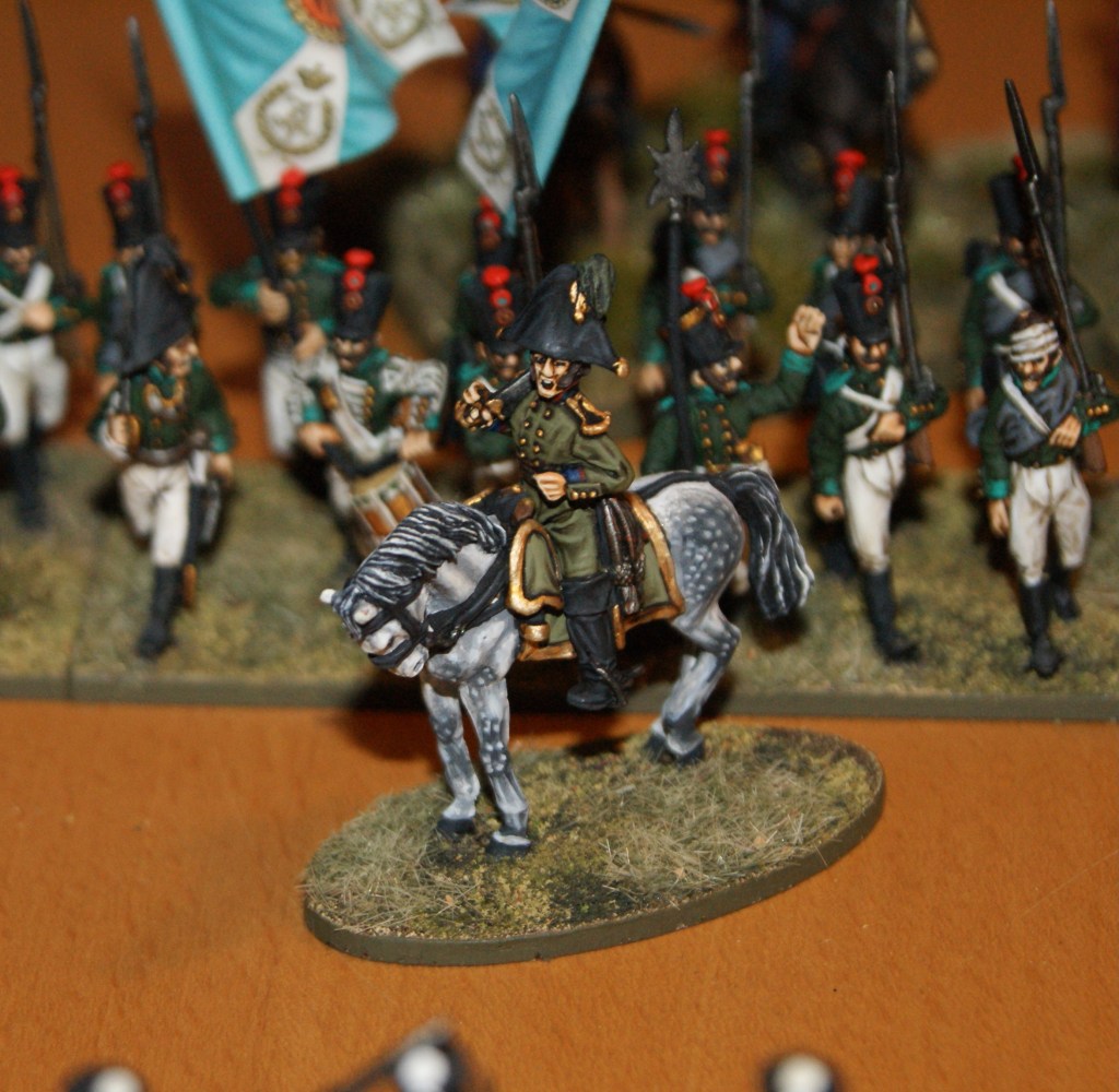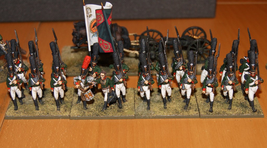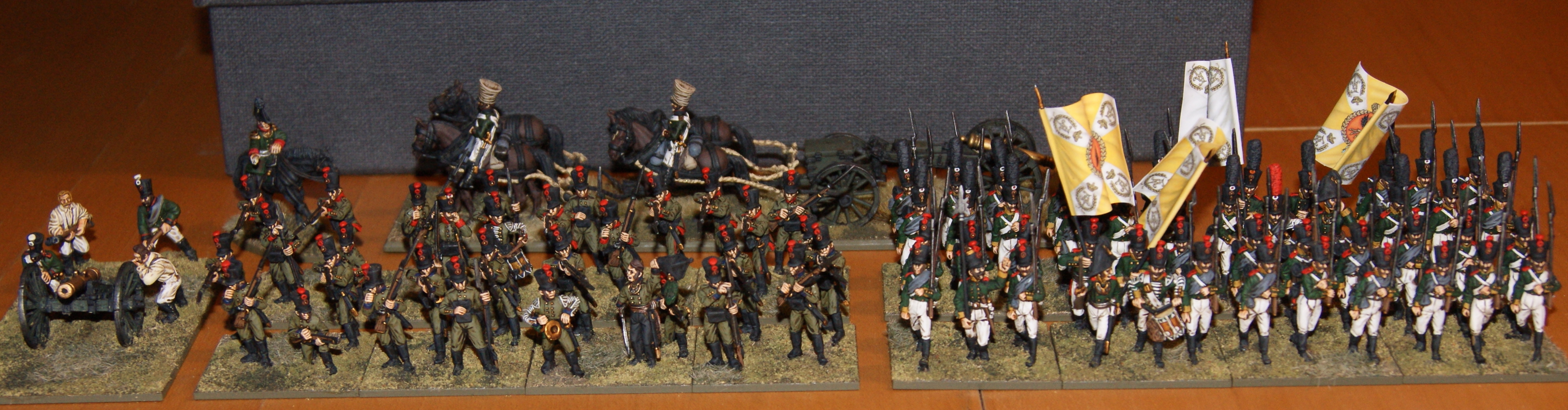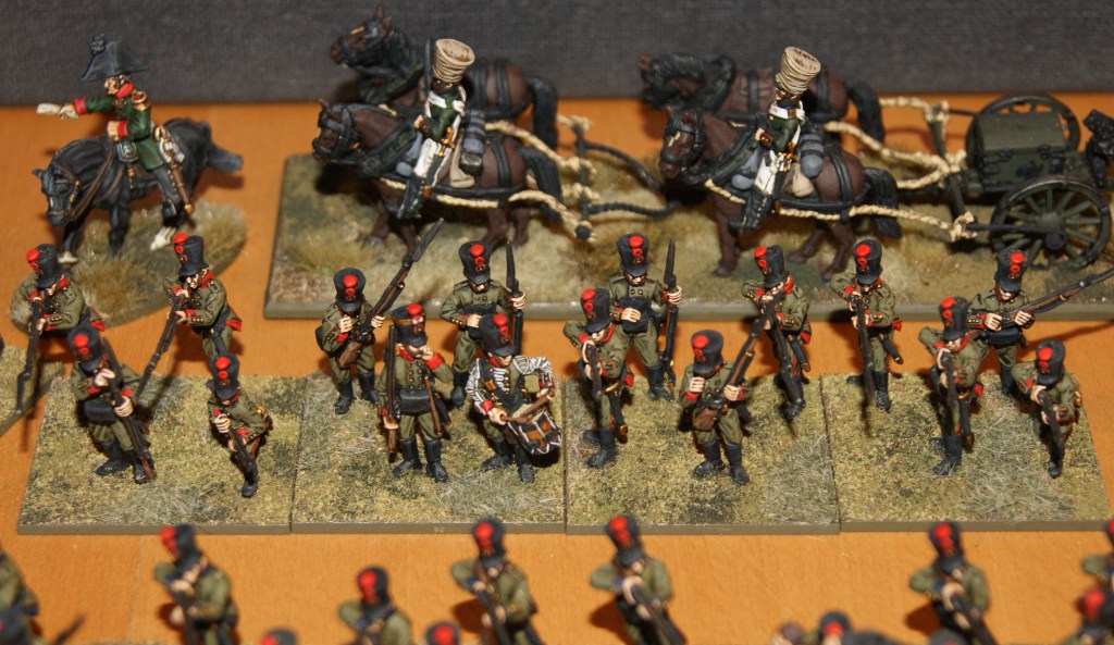 As you can see, the basic infantry figures are all Brigade Games figures (of the old Victrix range). The colonels are also by Brigade. Some commanders are Perry figures and some of them are Warlord figures. The artillery crew pictured here are all Warlord, with Brigade heads; the limbers and artillery pieces are all by Perry.