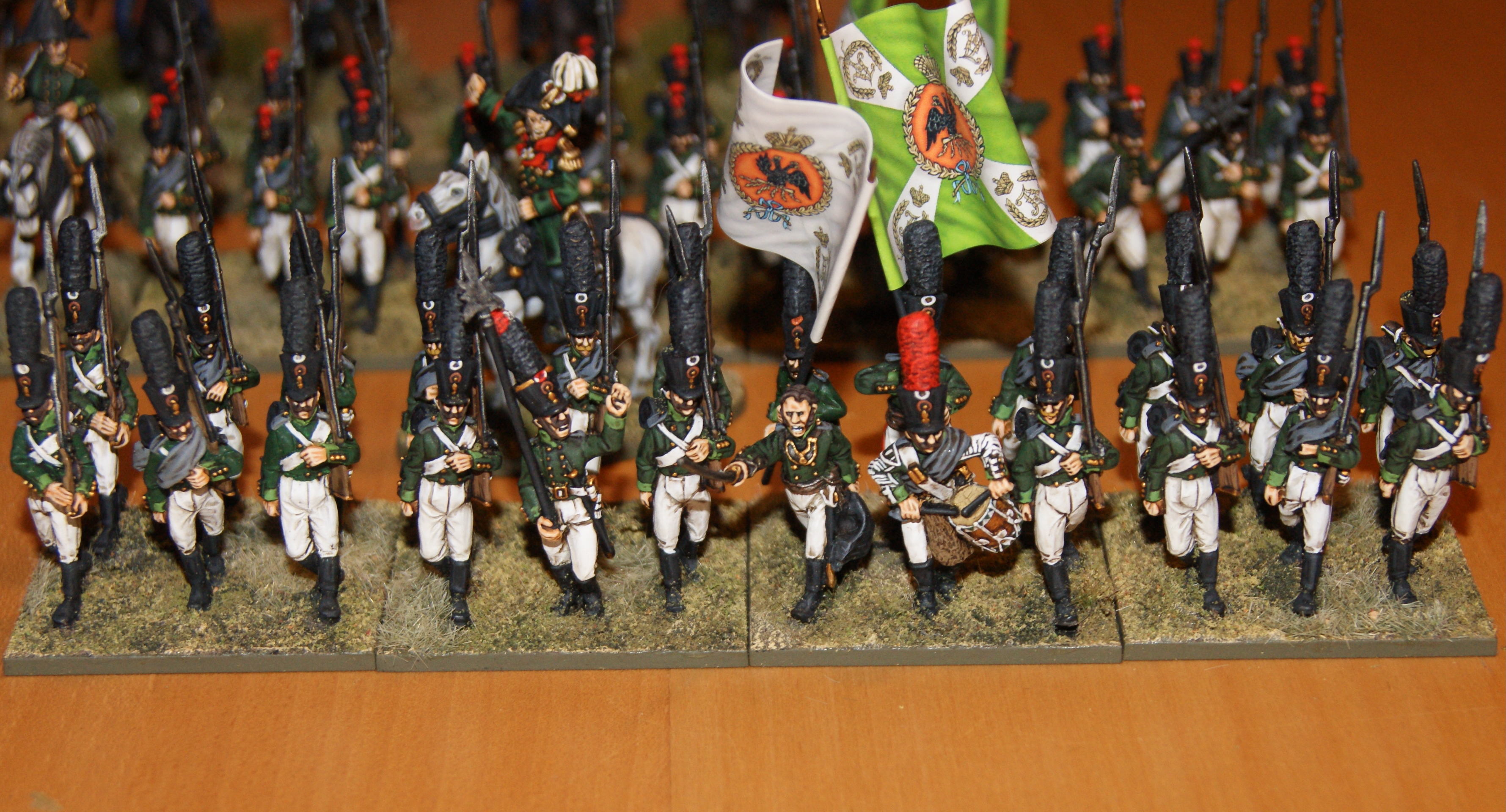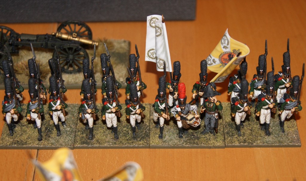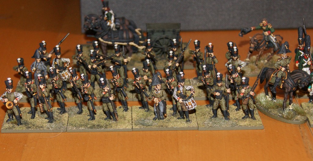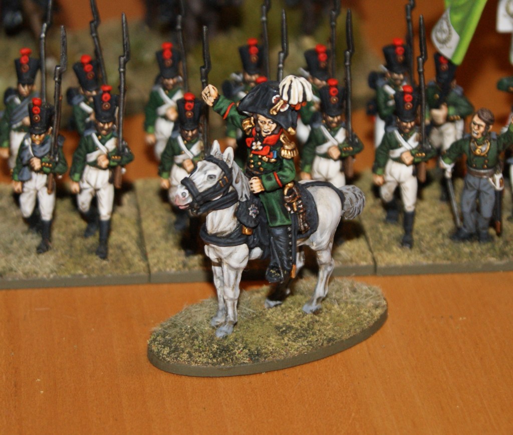 As you can see, the basic infantry figures are all Brigade Games figures (of the old Victrix range). The colonels are also by Brigade. Some commanders are Perry figures and some of them are Warlord figures. The artillery crew pictured here are all Warlord, with Brigade heads; the limbers and artillery pieces are all by Perry.