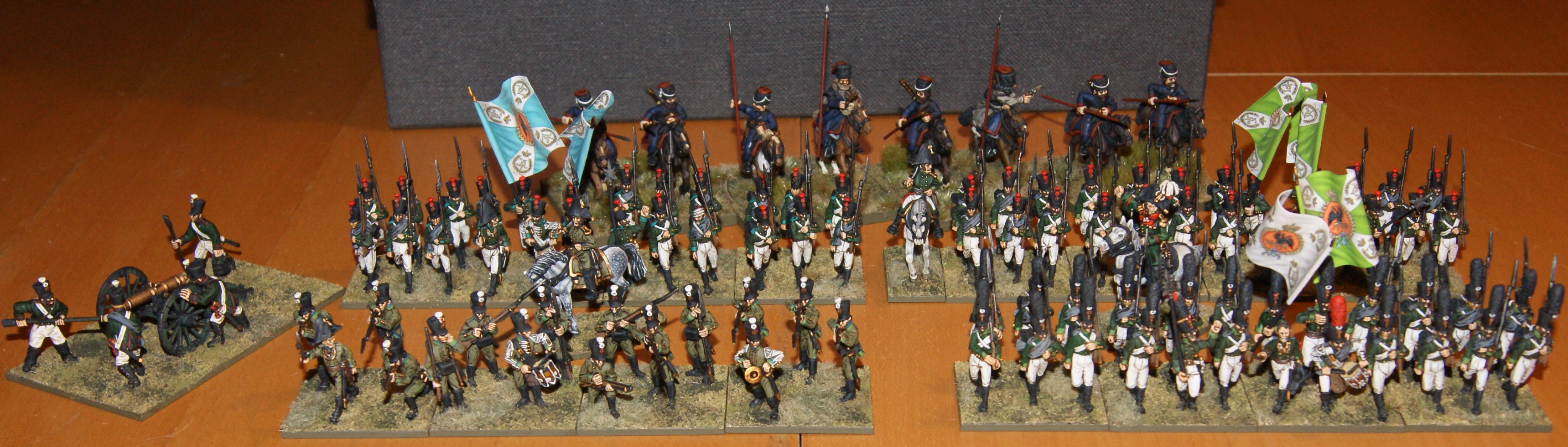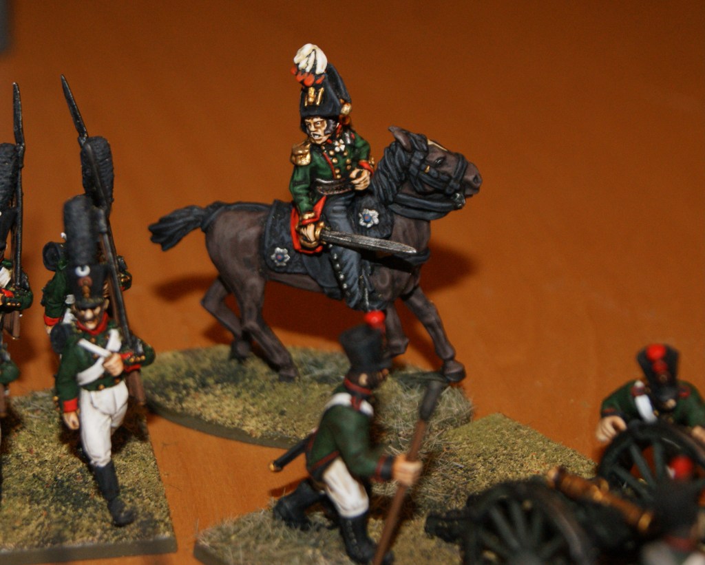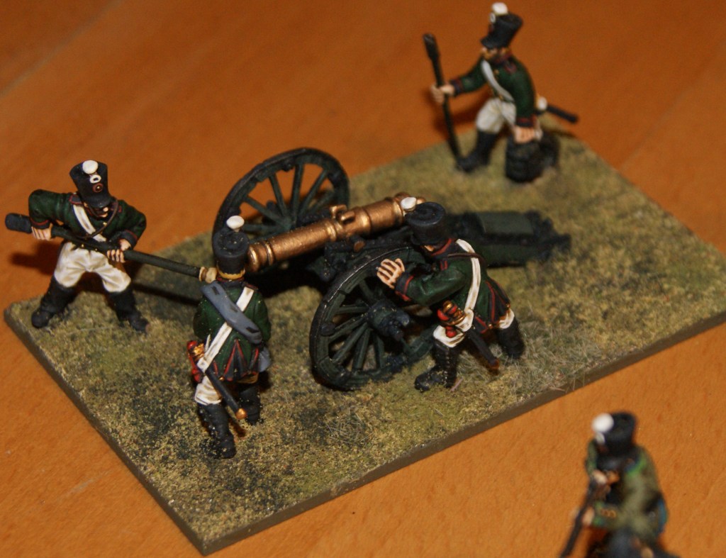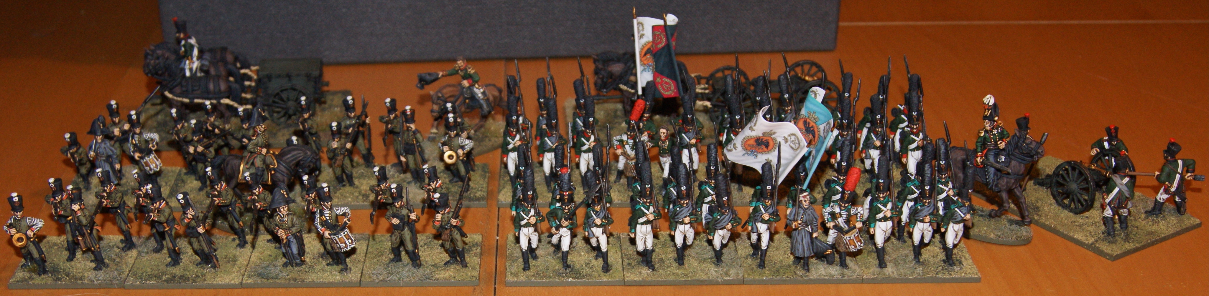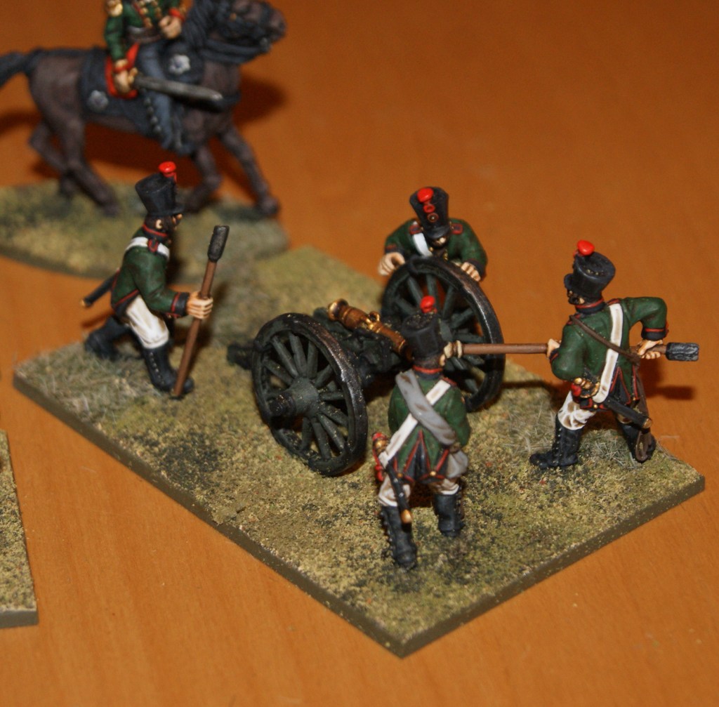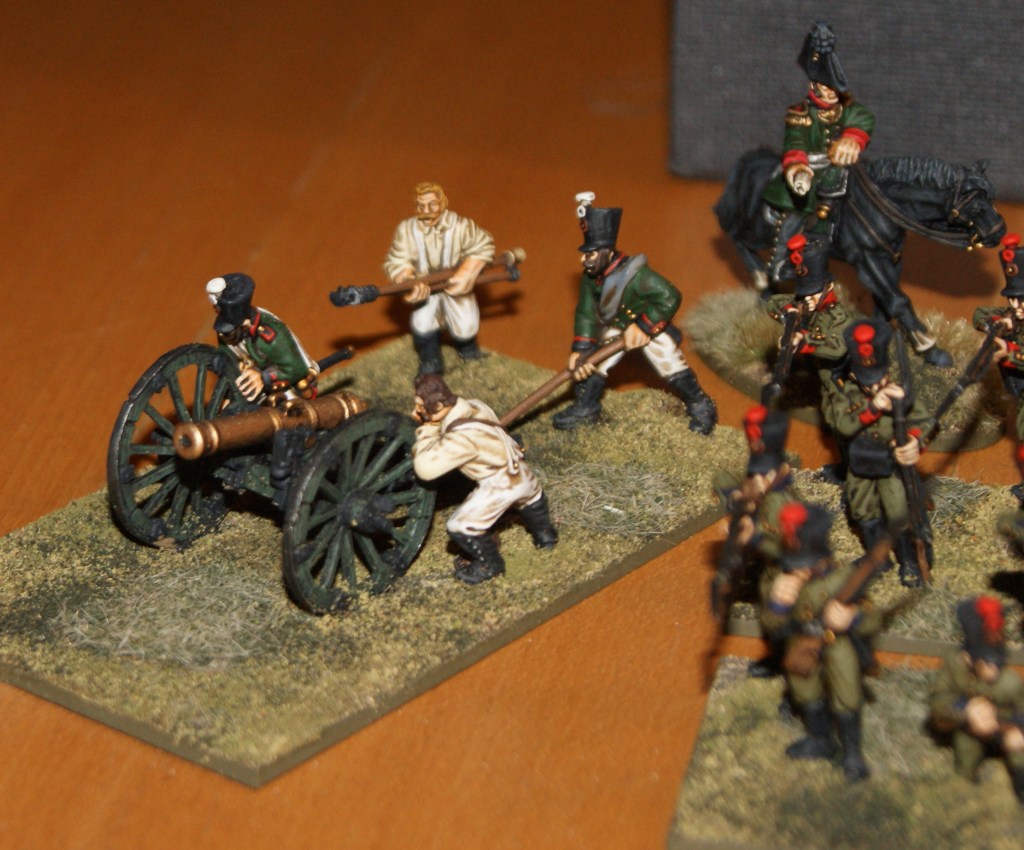 These are a good foundation, but a number of additions will hopefully follow soon. As I said, I will paint more skirmish figures soon (Ive already prepared them). One artillery limber is also missing (it sits unfinished in a box…). The plan is also to do two artillery pieces in each brigade rather than just one, although one is probably enough for many games. The artillerymen are already primed and ready for painting. The cavalry is also almost done. For them, the plan is to expand into 9 man units. The cossacks only need rebasing, and the hussars are almost there as well, still lacking a few finishing touches and basing. I also have plans for a command vignette, like the ones Ive already done for the Swedes. Again, the figures are already primed and ready to be painted.