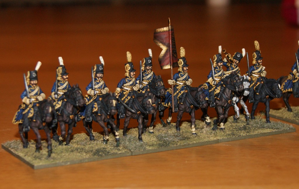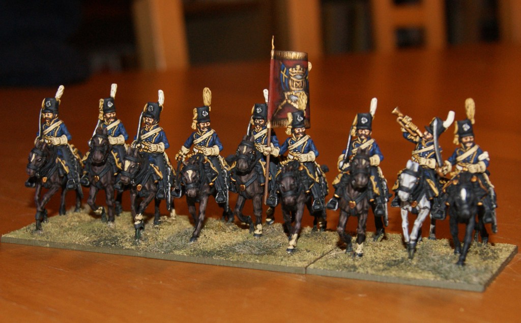 In the past couple of weeks, Ive been re-basing my 28mm Napoleonic figures. The Finnish army was already re-based, apart from the cavalry. I waited with the re-basing as I was planning to add more figures anyway. Now that Ive painted some additional figures to these, getting them up to 9 men per unit, it was time to re-base them. The closer basing does look better for cavalry and it somehow seems that this is the way the Perry figures are meant to be based. Also, these 9-man units now take up exactly the same amount of frontage as they did before as 6-man units (based less closely together).