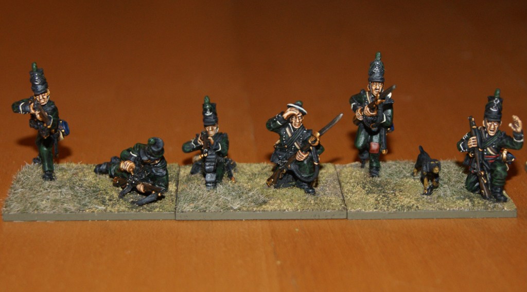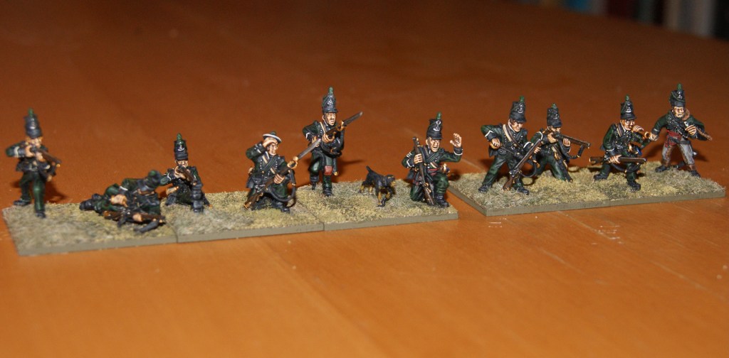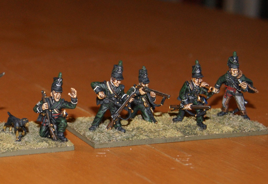 The Russian jägers are part of a larger collection which consists of quite a few miniatures, although mostly too few in each unit to make up useful battalions/squadrons in the new basing scheme. The skirmishers are of course easy to do as they are. Im hoping to add the necessary figures sometime in the future, so maybe more to come there further down the road. In particular, Id be looking to paint a jäger battalion in the style of these chaps.