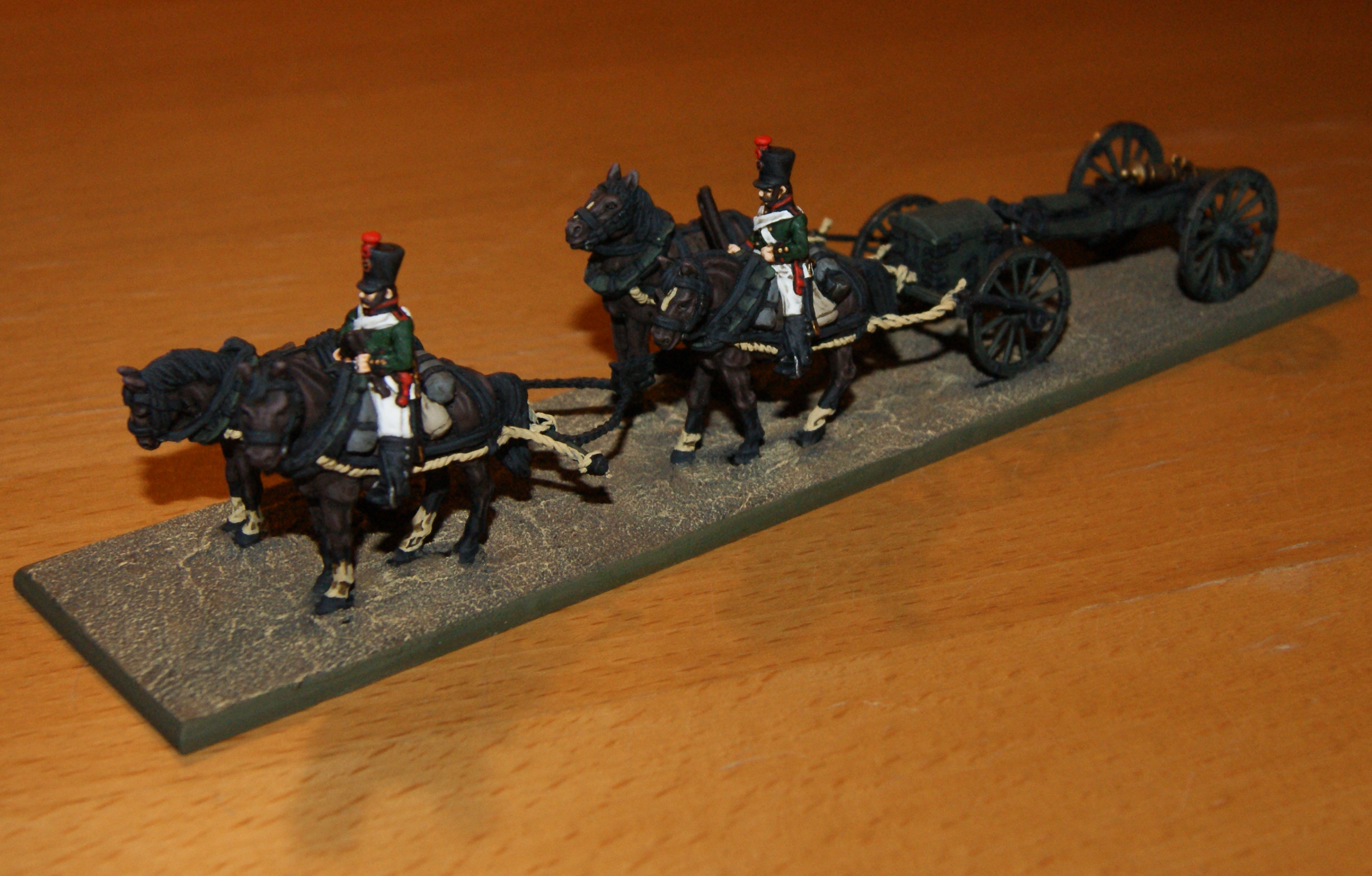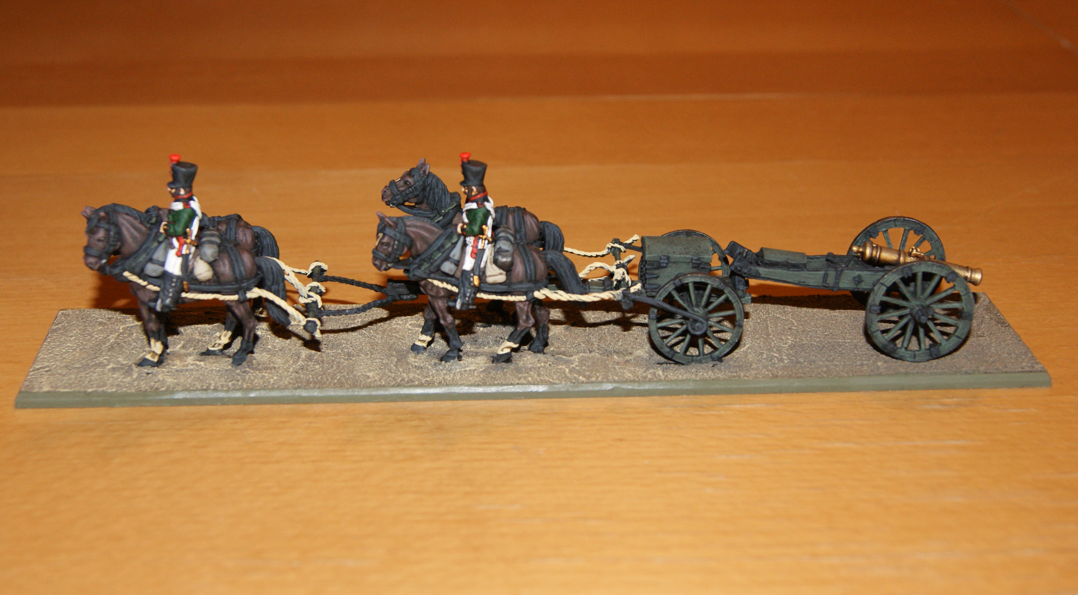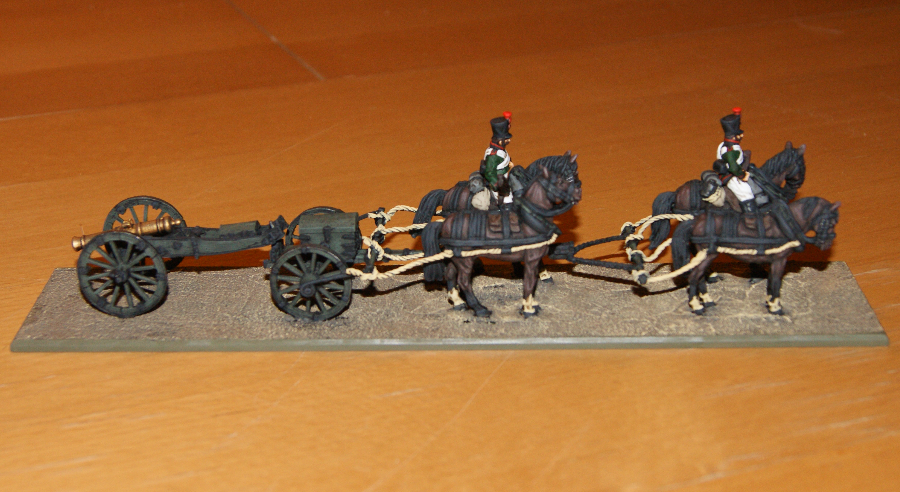 A small step for the Russian 1808 collection. In fact, even though this is just one piece, limbers are always some of the most labor-intensive models that you would do for Napoleonic figures. This 6-pounder limber is the third I have done, which means I have one limber team for each brigade, two 6-pounders and one 3-pounder. Id like to do a 12-pounder battery with limber as well at some point. However, the 6-p team will do nicely as a stand in for a 12-p limber team until then – and I havent even started on the guns and artillerymen of the 12-pounders yet. 12-p teams were of six horses rather than four. However, I know that the Swedish army reduced the number of horses for their artillery during 1808. It would not be impossible to imagine that the Russians might have done the same, and actually used only four horses for the 12-pounders as well. In any event, Ill be quite pleased when I have finished the rest of the Russian artillery that I have prepared. I have about 10 crew and three cannon still to go. Having done the third limber team, the largest hurdle is now behind me.