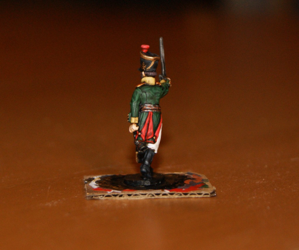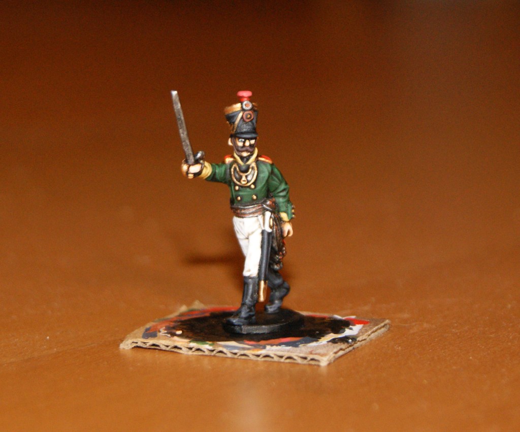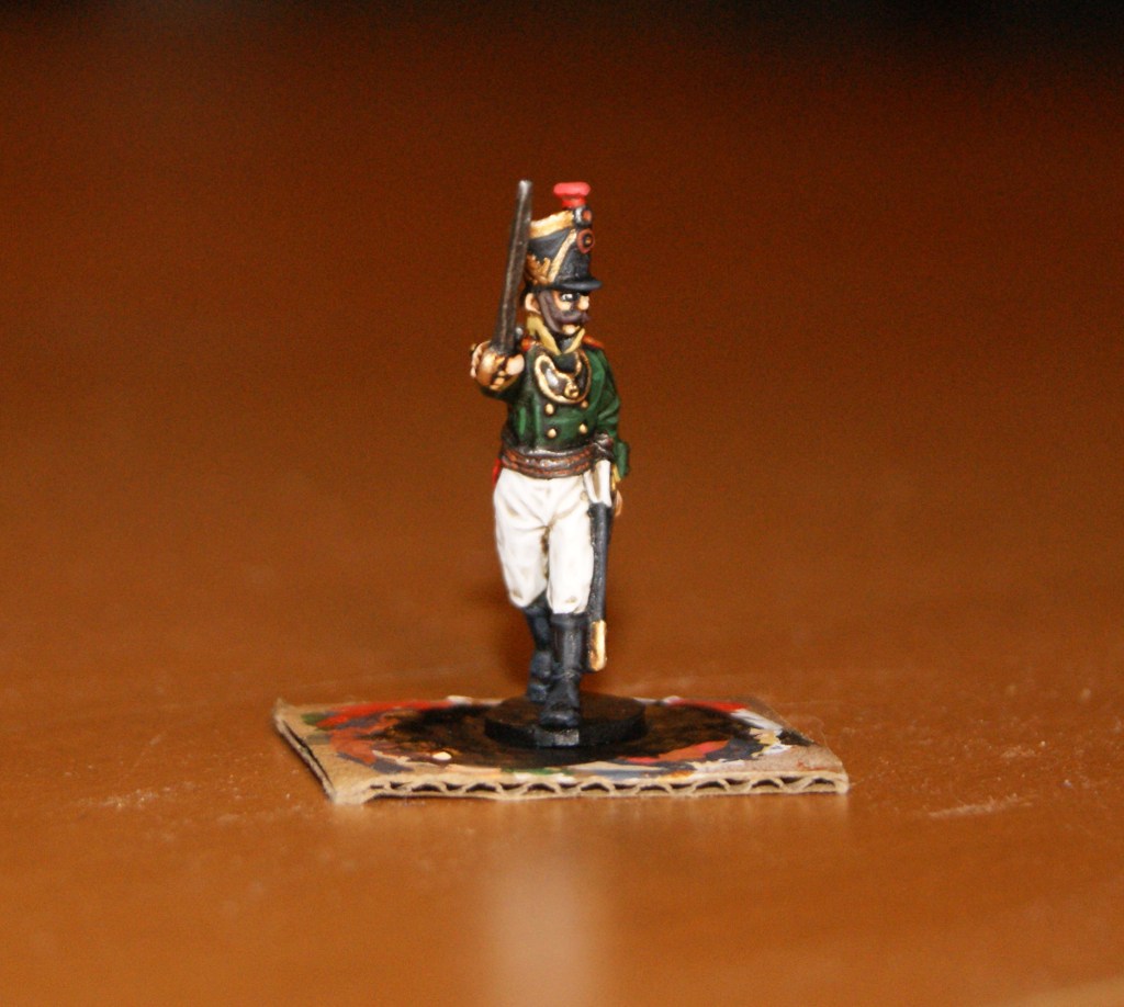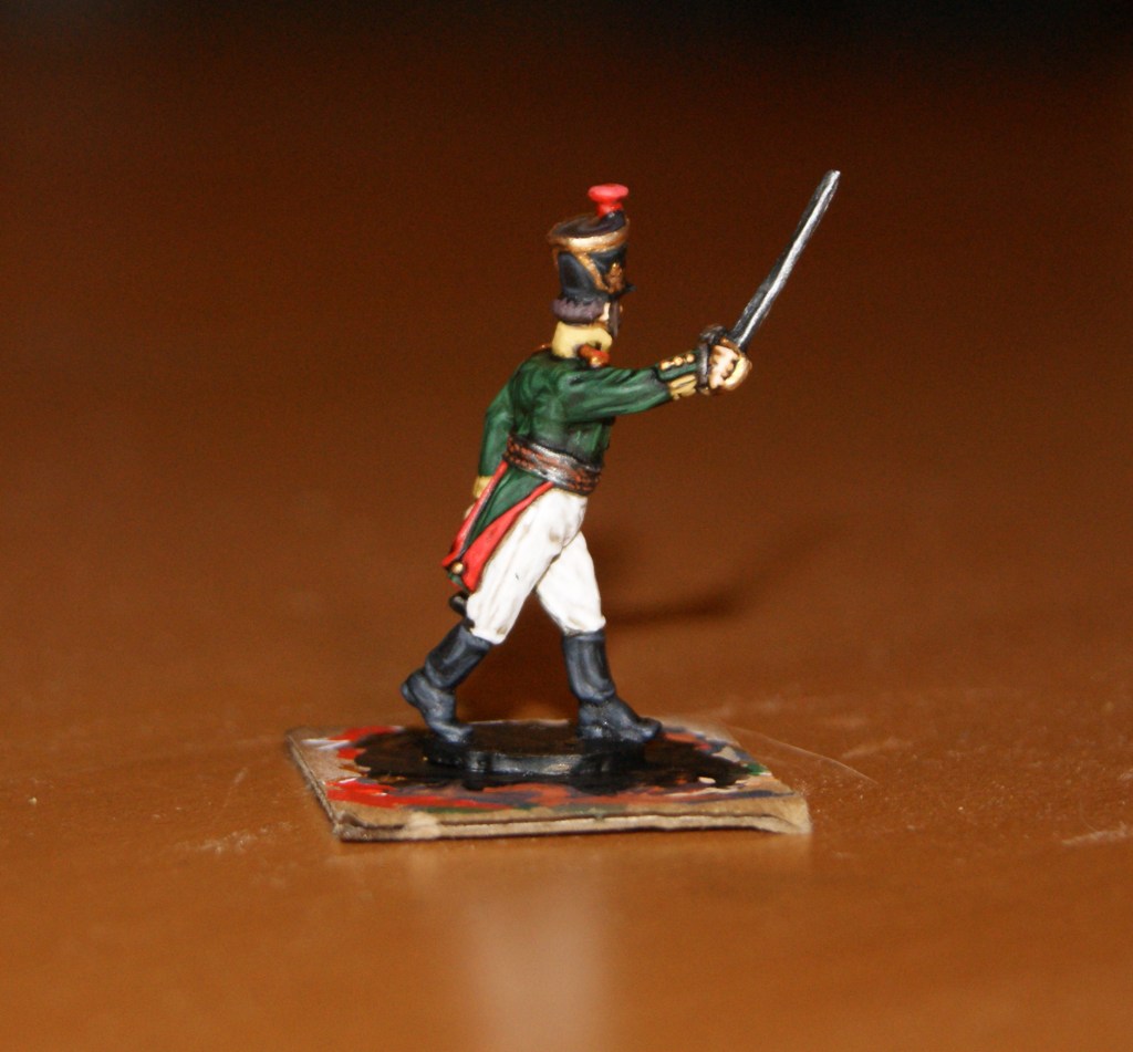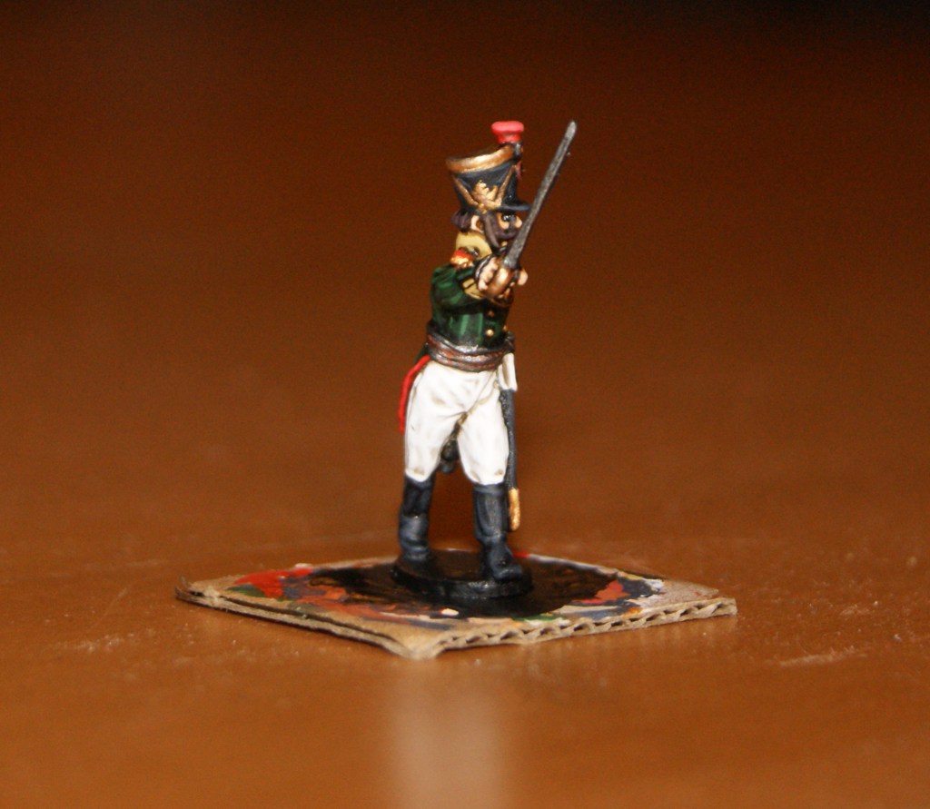 As many readers will know, Russian officers in the early Napoleonic period seem to have worn bicornes. However, after 1805, officers were allowed to wear a shako, and at least by 1807 there was a distinctive officer’s shako with an eagle ornament and decorative chin straps or chains. There are no miniatures that I know of with this headgear, so I decided to try to convert one. The conversion was very simple, I just swapped heads with an NCO model (both figures are by Brigade Games).