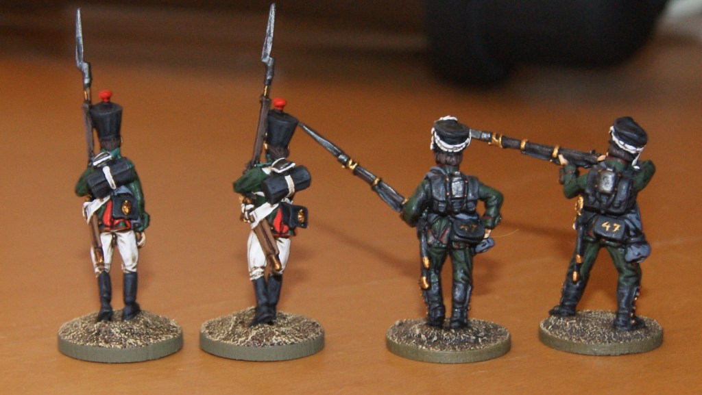 Brigade Games musketeers on the left, with cylindrical packs. Perry 1812 jägers with new square backpacks on the right.