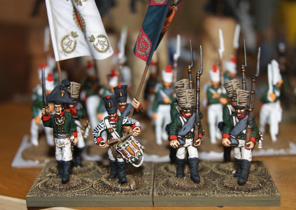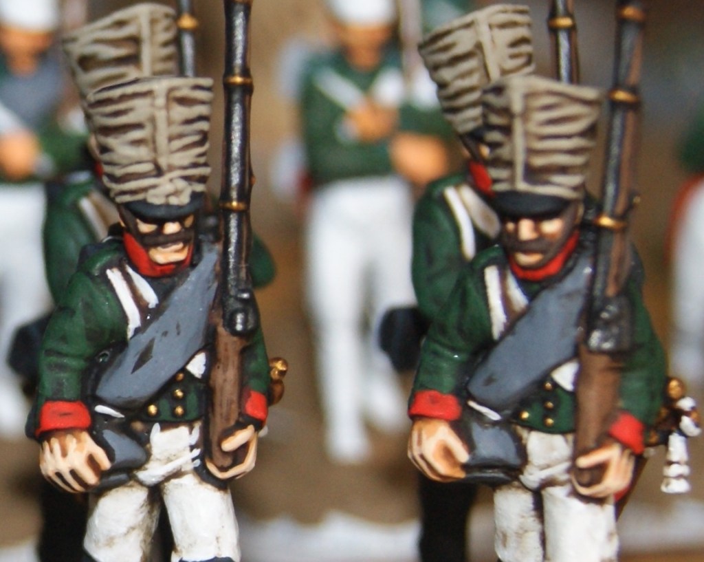 The Warlord set is slightly different from the Brigade Games figures in three important aspects: the shako, the belts, and the backpack. To be 100% historically accurate, you would need to do quite a few modifications to the Warlord figures. I have made these as a compromise, doing some simple changes to make the Warlord figures work better for 1808, although purists would perhaps disapprove!